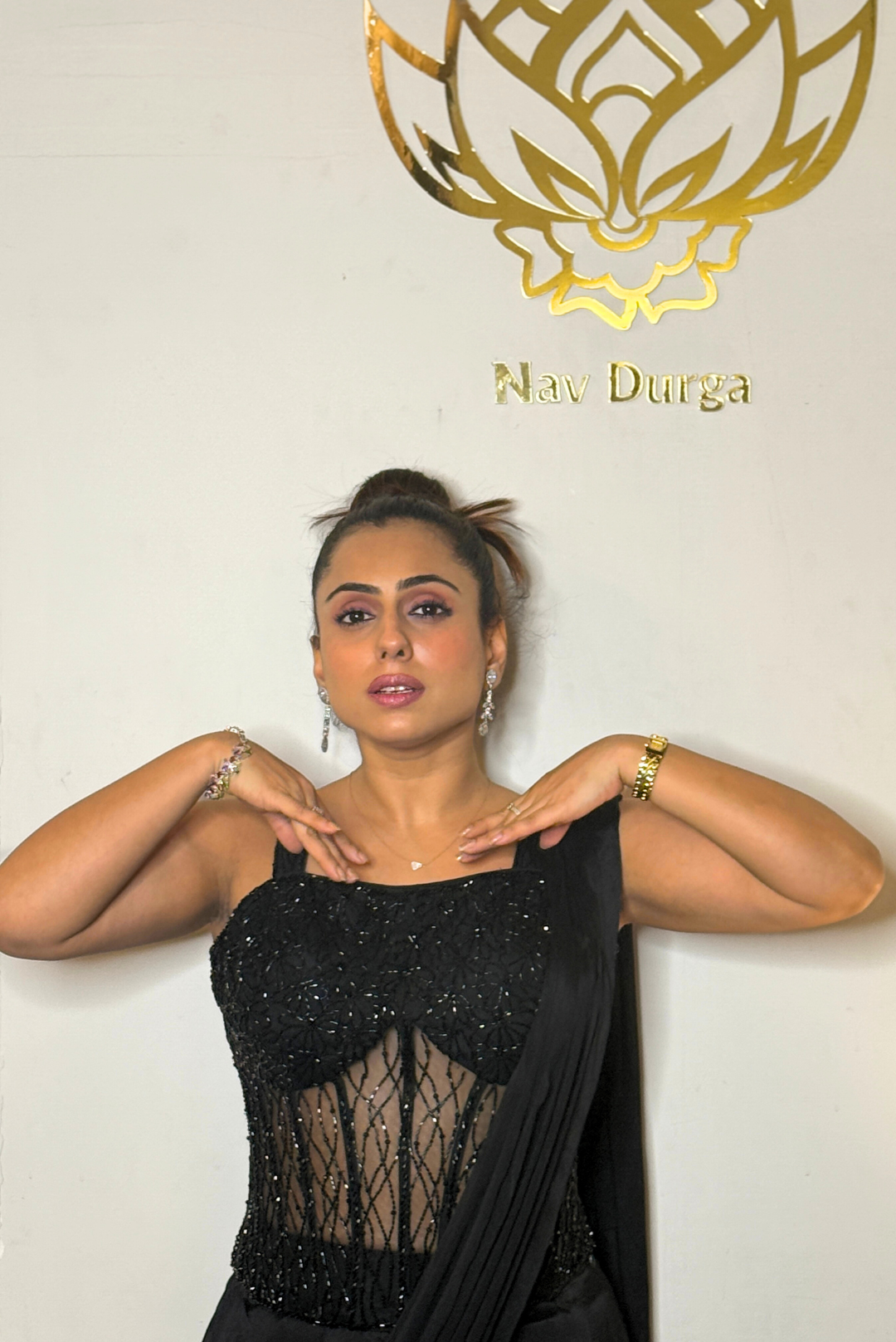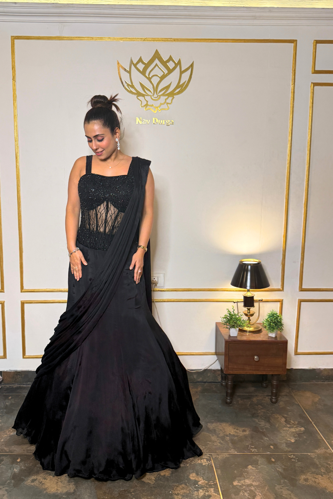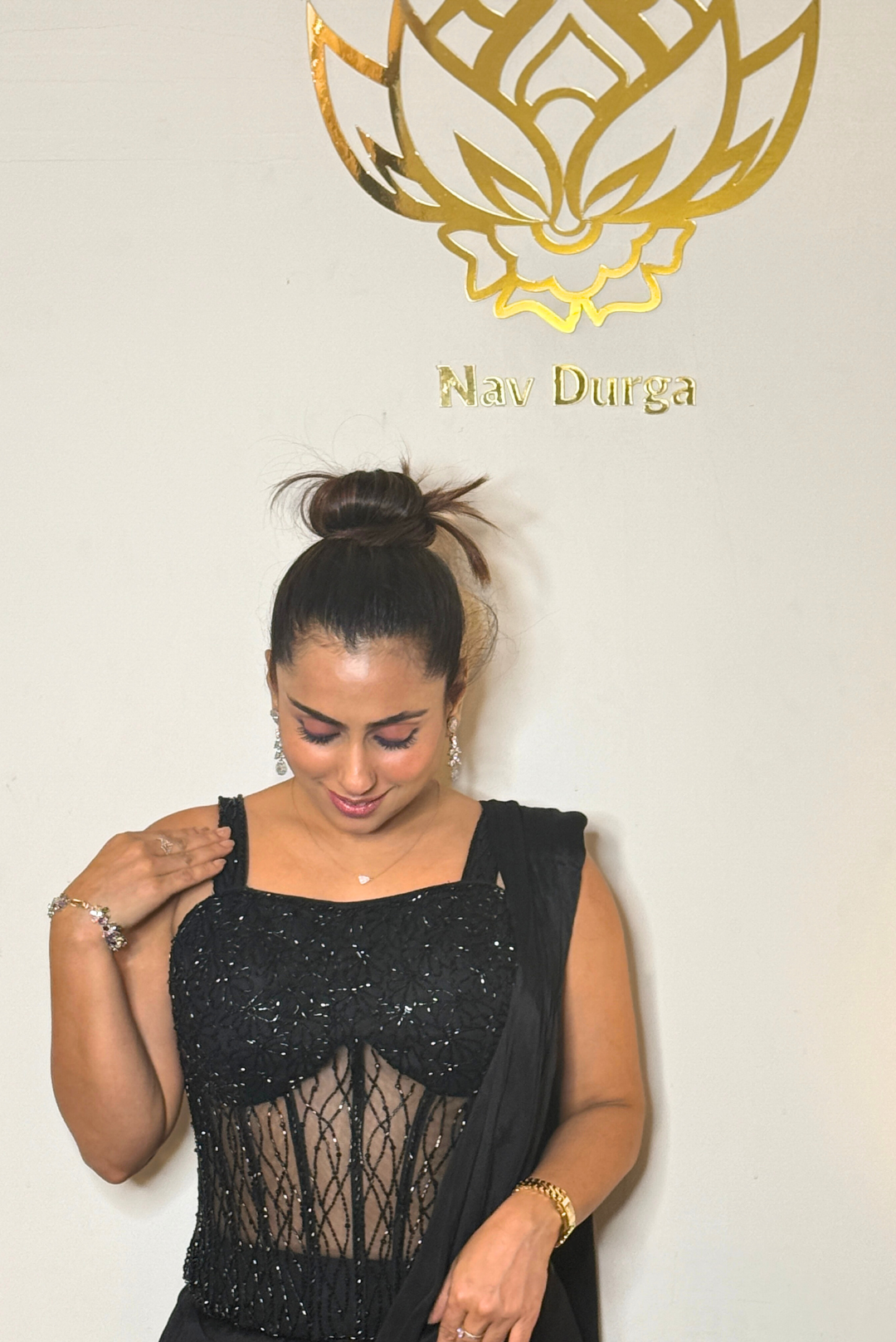 Turn heads with this bold black Indo-Western set, crafted in luxurious Chinon fabric and adorned with refined sequin and cutdana work. The structured corset blouse with a sleek square neckline adds a touch of modern drama—perfect for cocktail nights, receptions, or glamorous festive evenings.