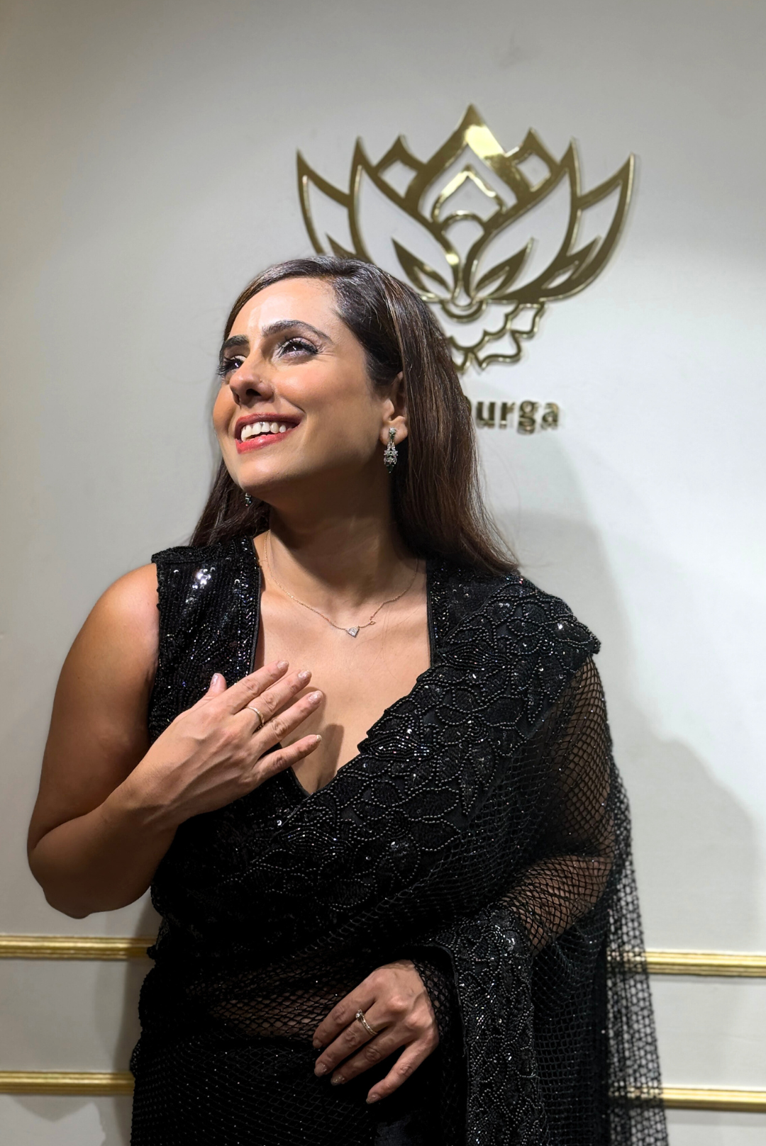 Make a bold statement in this black net 2-part saree, intricately adorned with crystals, cutdana, pipes, and sequins. The refined V-neck blouse complements the shimmering details, offering a perfect balance of modern allure and timeless sophistication—ideal for evening soirees, receptions, or festive celebrations.