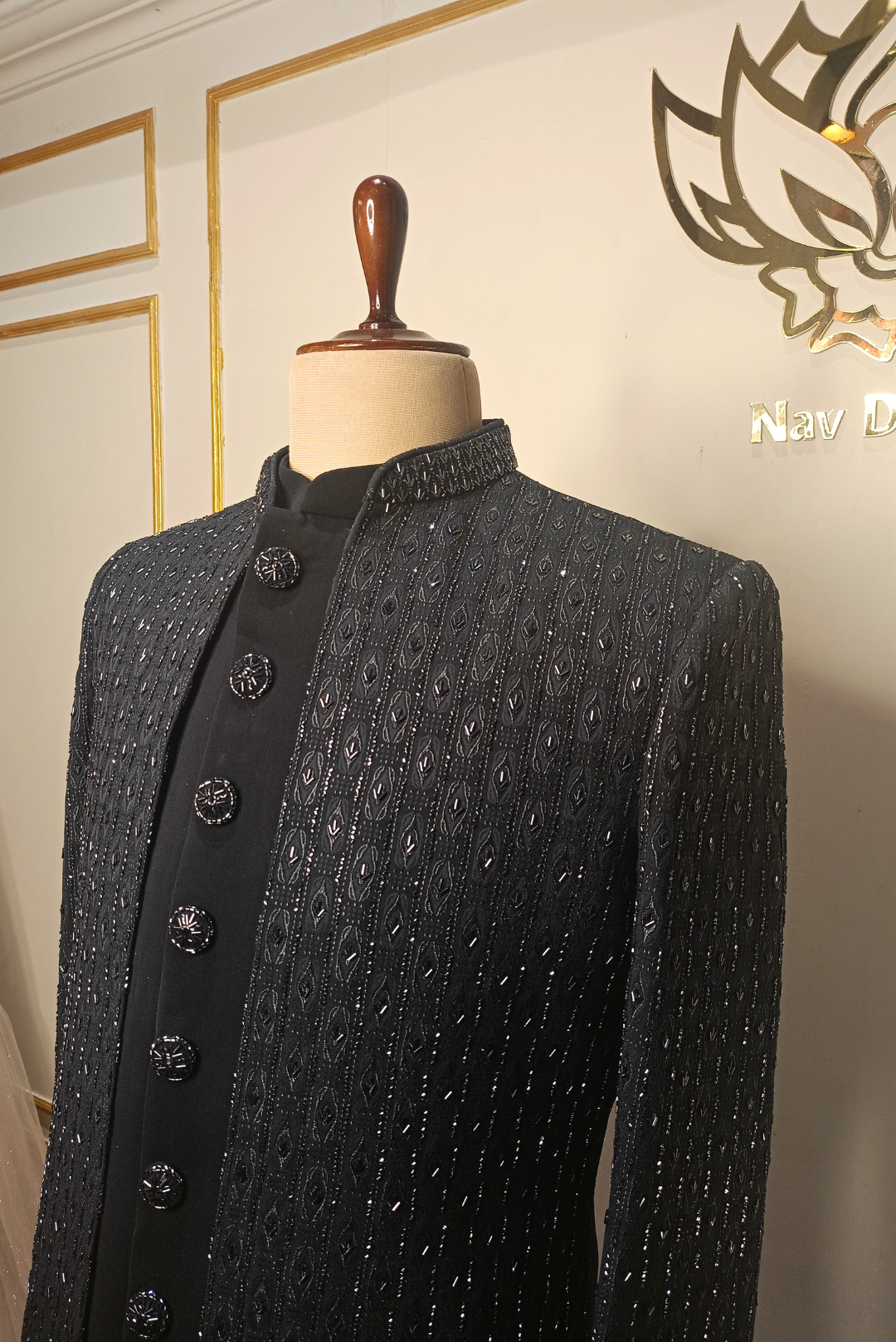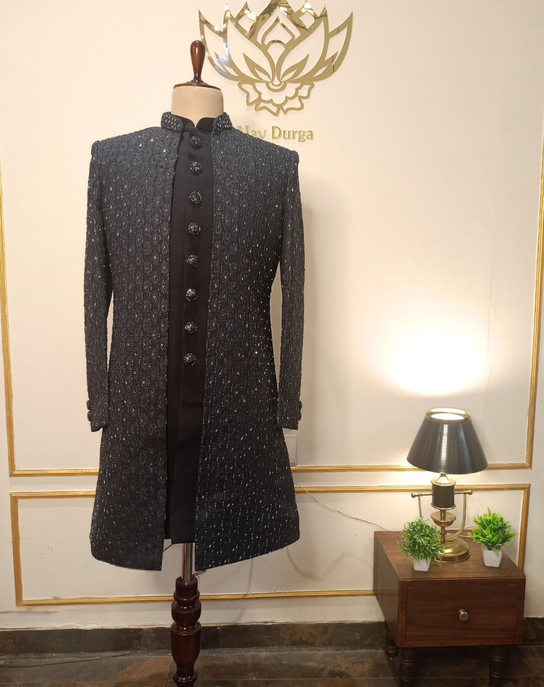 Refined and versatile, this navy blue Indo-Western set in rich sand silk exudes effortless sophistication. The sharp Chinese collar and intricate cutdana and chir detailing lend it a contemporary edge—perfect for festive celebrations, cocktail nights, or elegant wedding events.