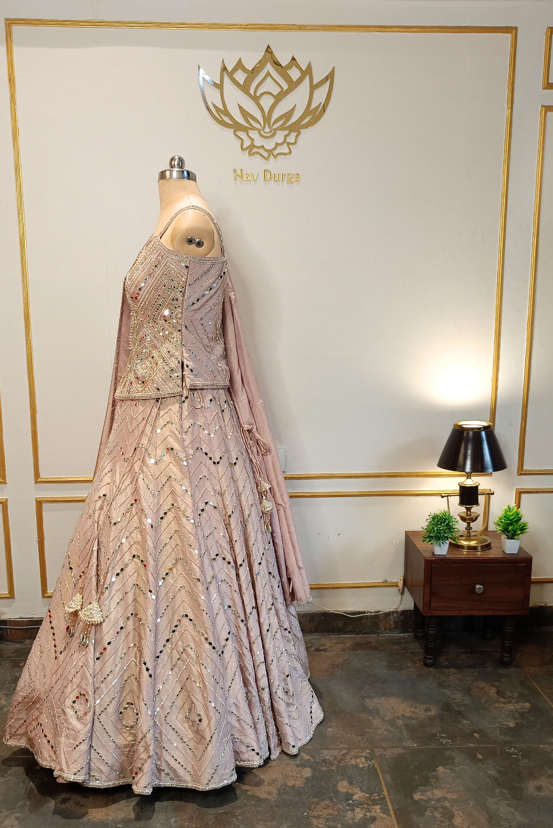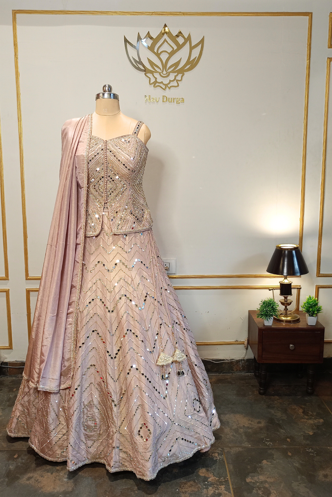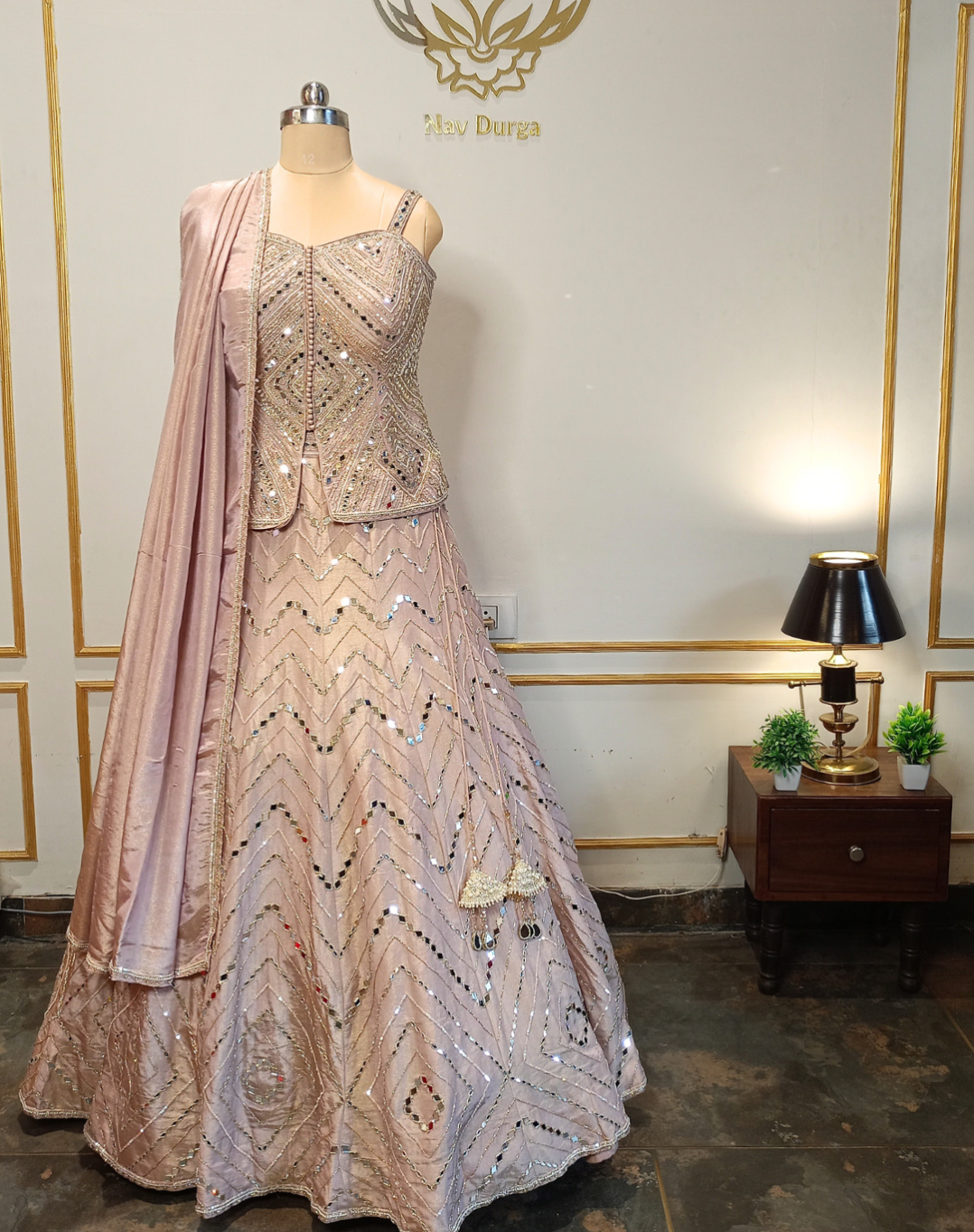 Delicate and dreamy, this dusty rose pink silk lehenga features intricate chir, mirror, and cutdana work that catches the light beautifully with every move. The sweetheart neckline adds a soft, feminine charm, making it an ideal choice for engagements, festive celebrations, or intimate weddings.
