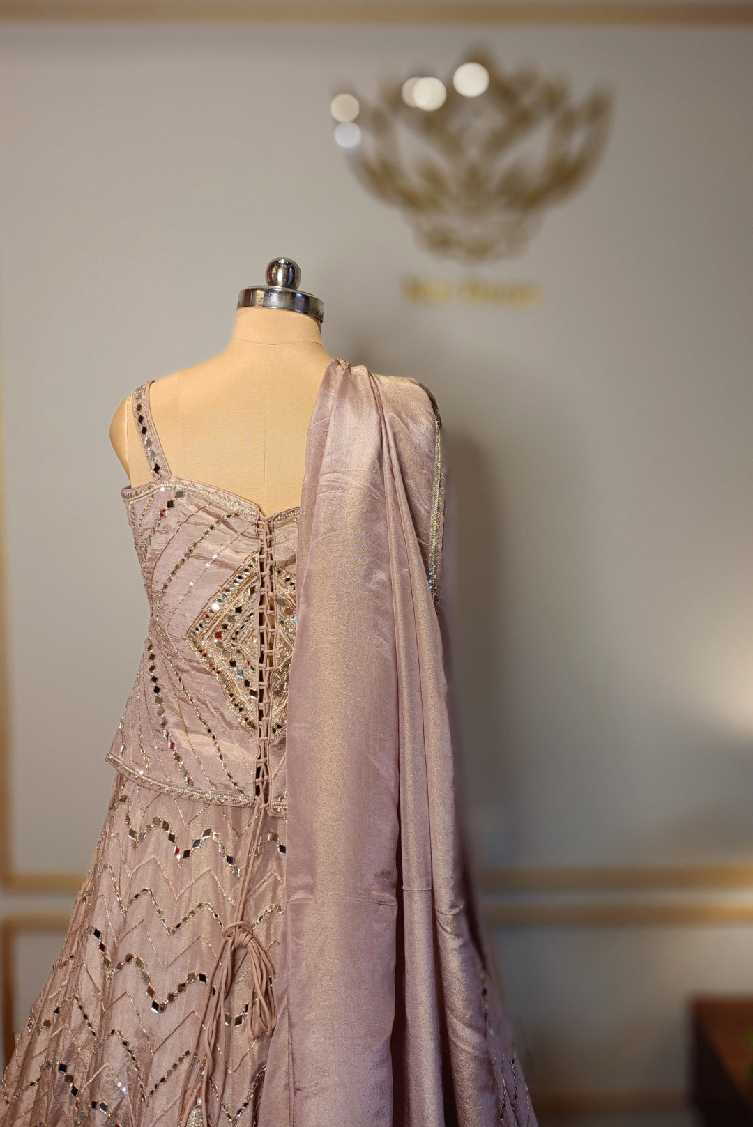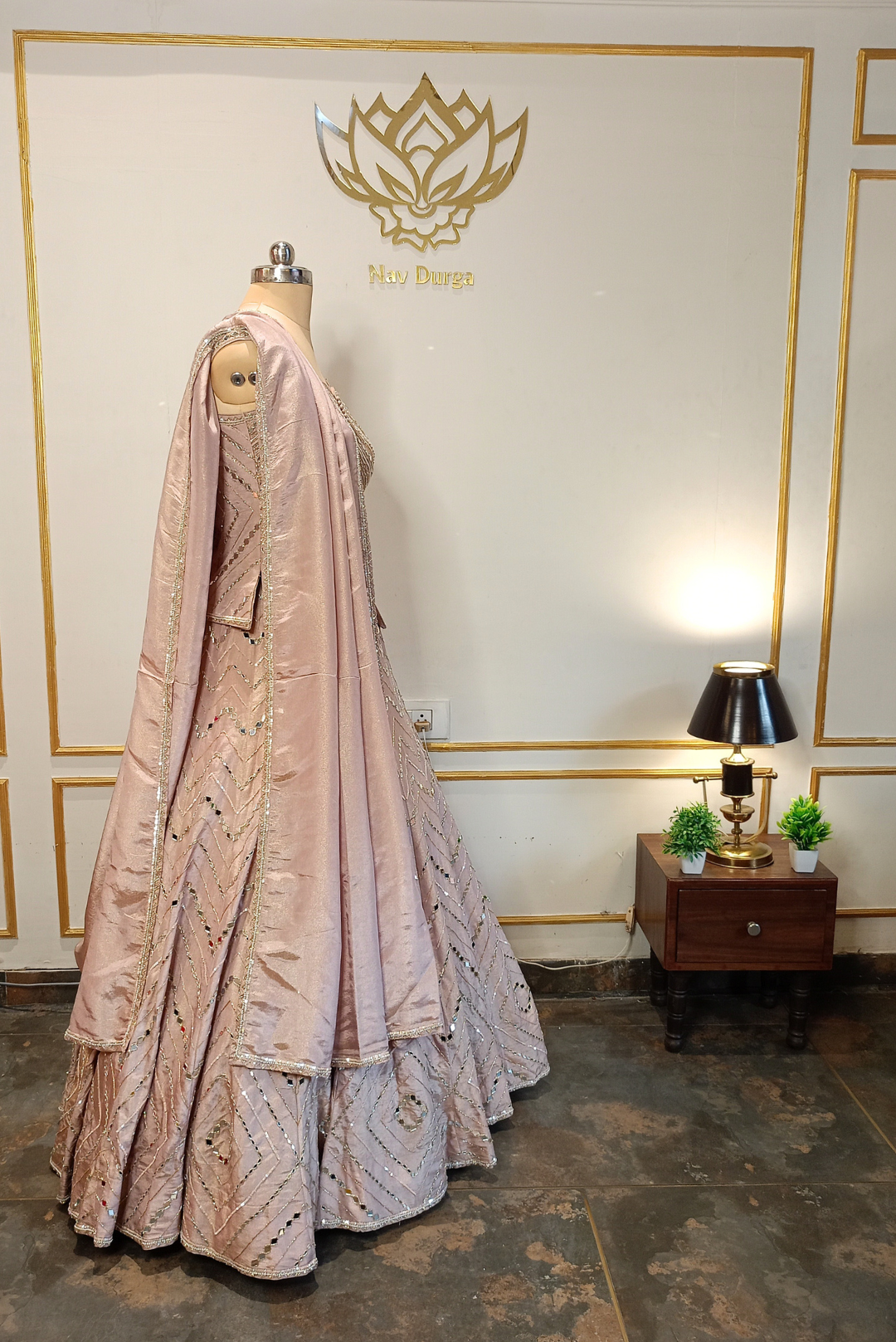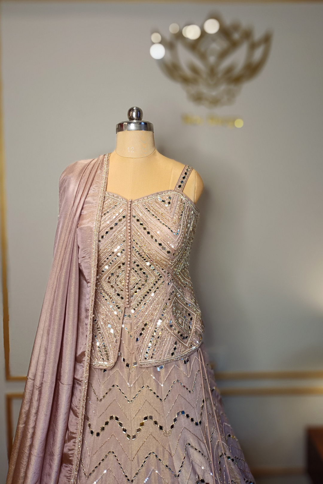 Delicate and dreamy, this dusty rose pink silk lehenga features intricate chir, mirror, and cutdana work that catches the light beautifully with every move. The sweetheart neckline adds a soft, feminine charm, making it an ideal choice for engagements, festive celebrations, or intimate weddings.