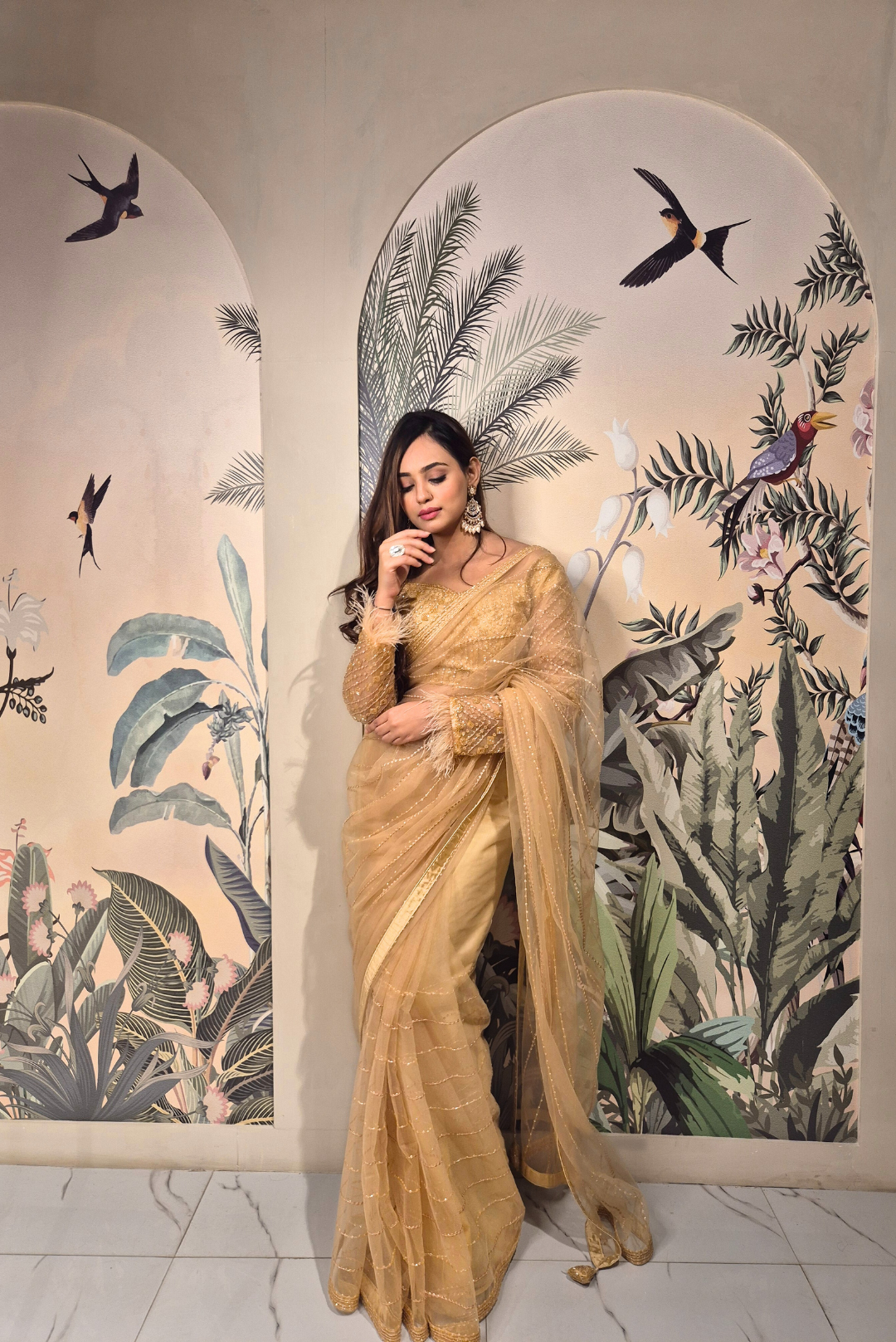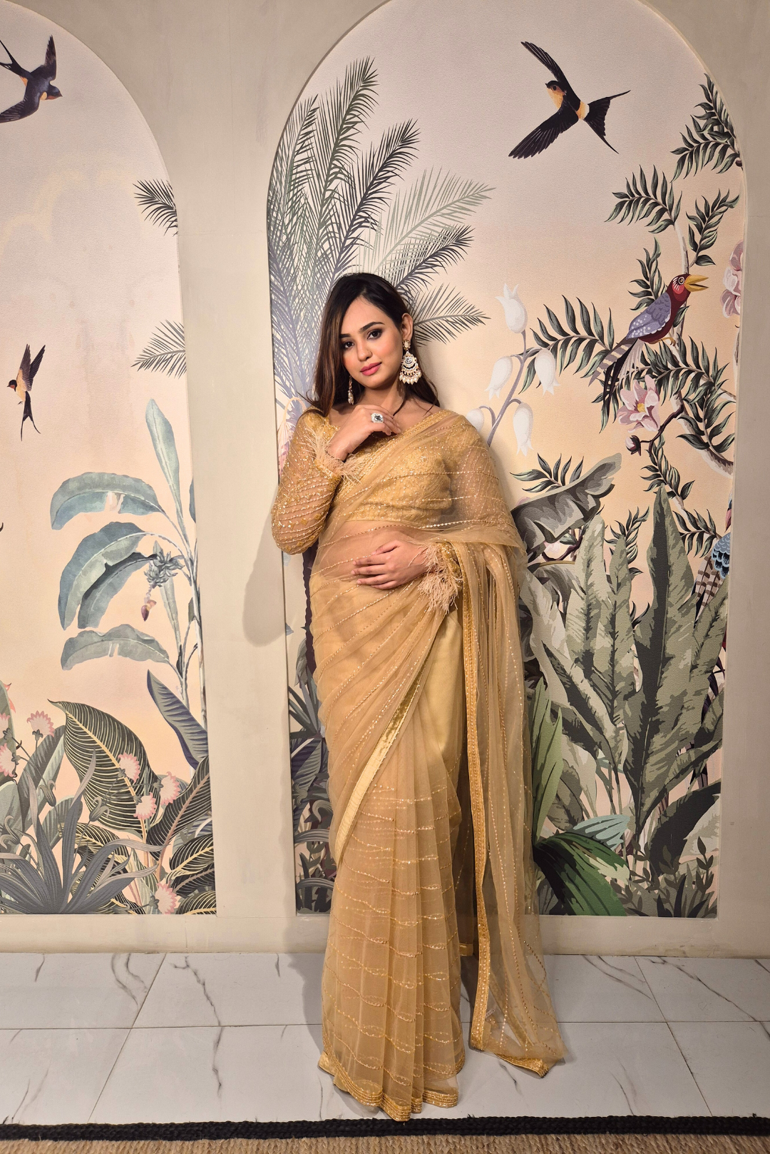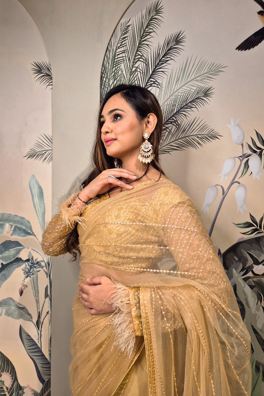 Turn every head with this striking gold net saree, adorned with intricate cutdana and sequin detailing, finished with playful feather accents for a touch of drama. The sweetheart neckline adds a graceful charm, making it an ideal choice for receptions, cocktails, and festive evenings.