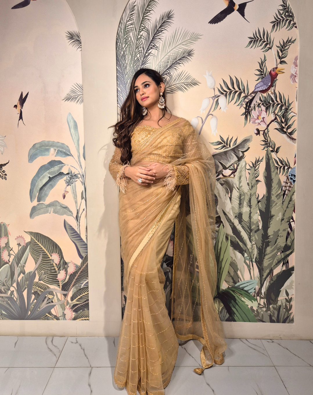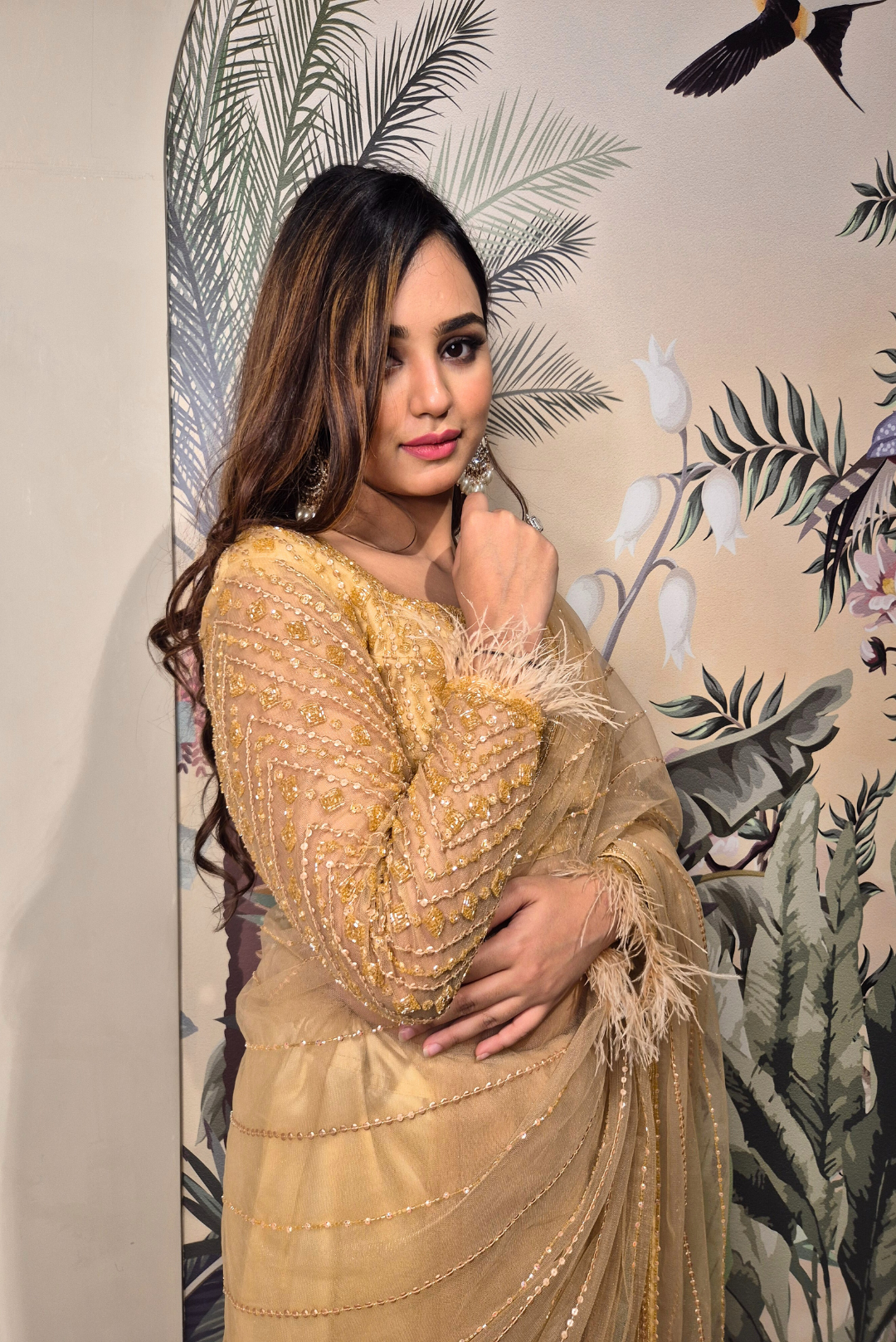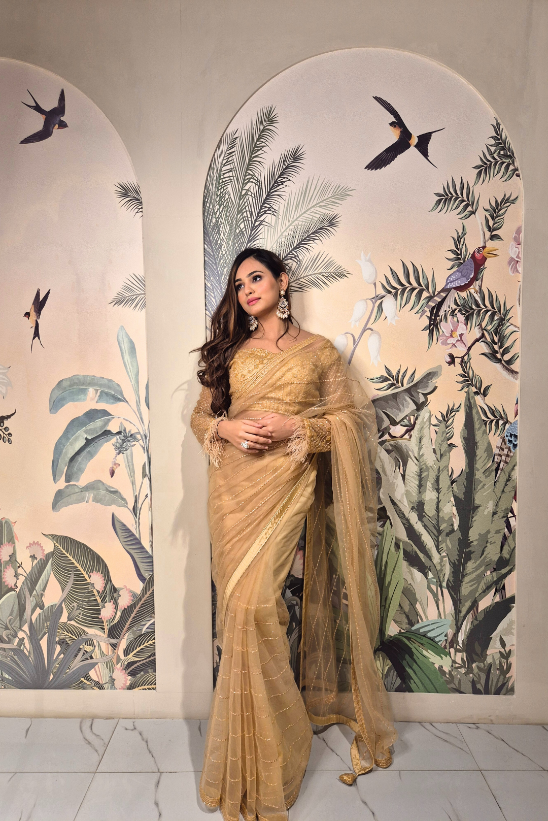 Turn every head with this striking gold net saree, adorned with intricate cutdana and sequin detailing, finished with playful feather accents for a touch of drama. The sweetheart neckline adds a graceful charm, making it an ideal choice for receptions, cocktails, and festive evenings.