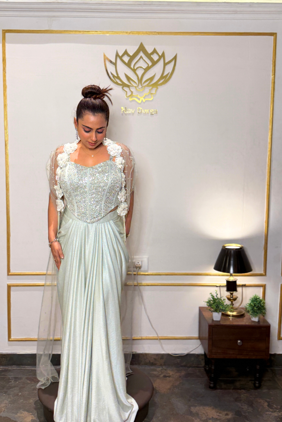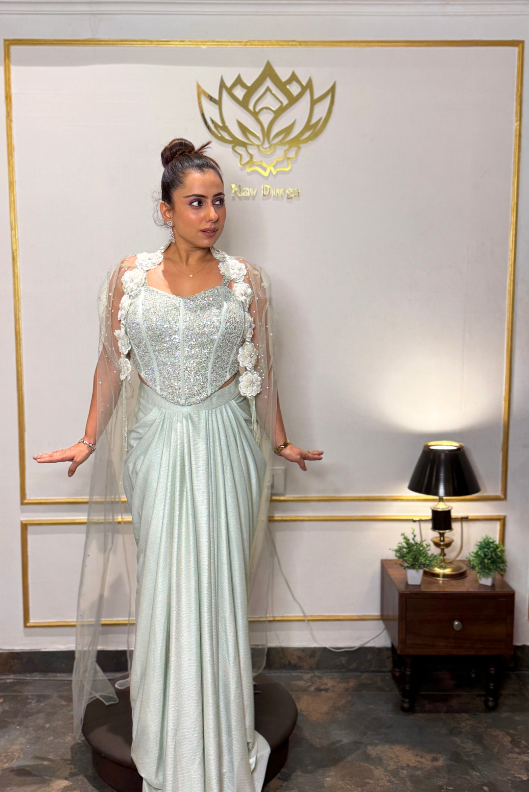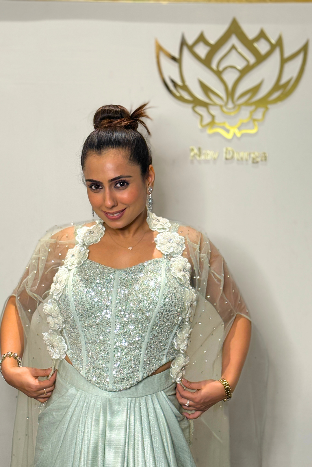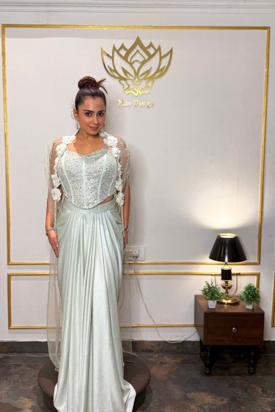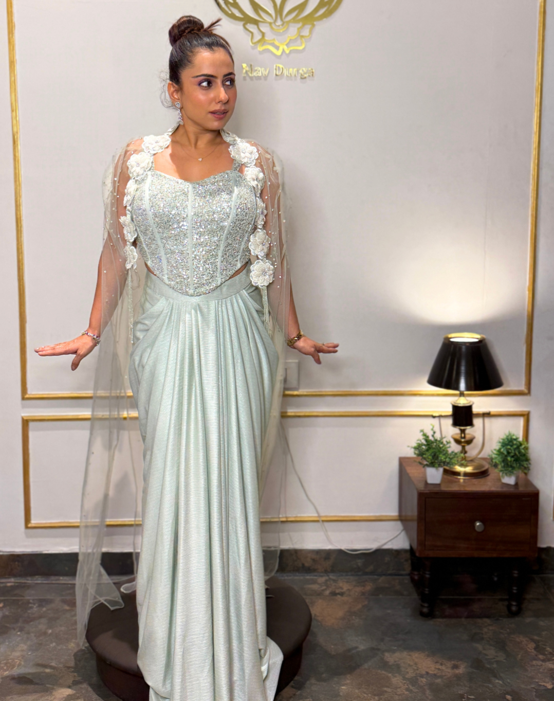Make a refreshing style statement in this aqua Indo-Western set, featuring a chic corset blouse, draped skirt, and a flowy net cape. Adorned with delicate sequins, floral detailing, and cutdana work, its sweetheart neckline adds just the right touch of glamour—perfect for cocktail nights, sangeet celebrations, or festive soirées.