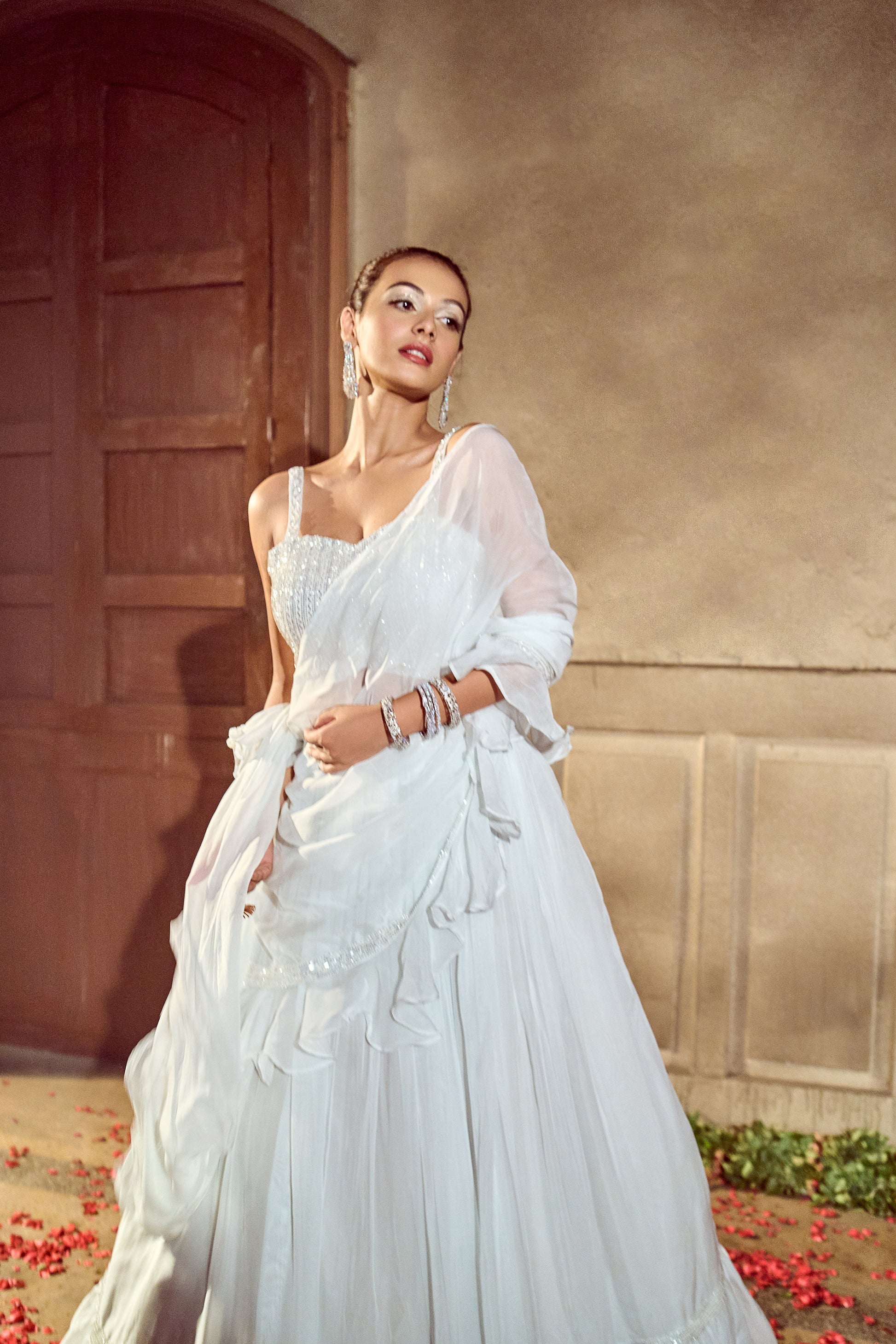 Own the spotlight in this dreamy sky blue Indo-Western lehenga, crafted in flowy organza with delicate sequin and cutdana detailing. The spaghetti sweetheart blouse adds the perfect touch of modern elegance—ideal for wedding soirées or chic celebrations.