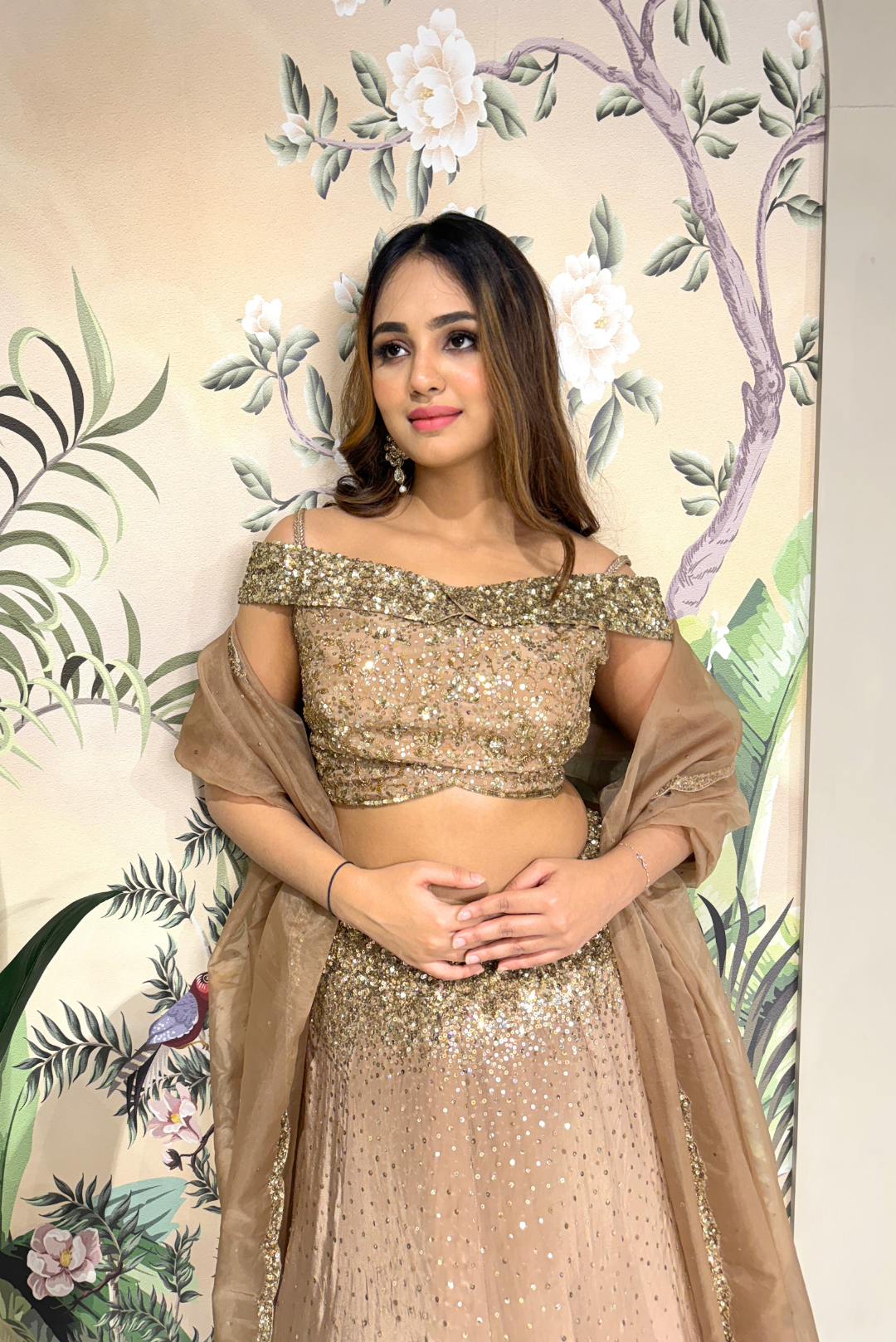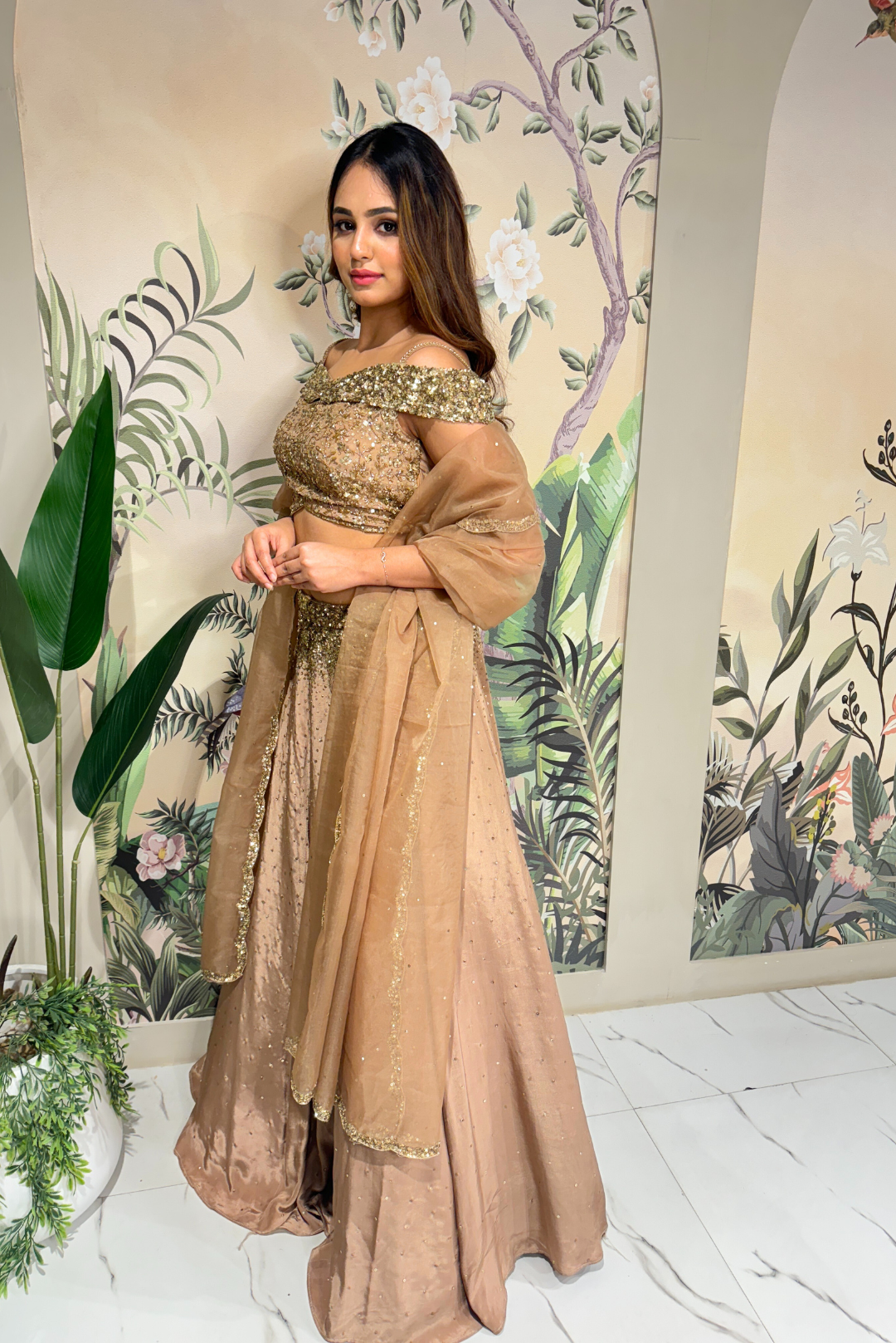 Make a statement in this gold crepe Indo-Western lehenga, adorned with delicate cutdana and sequin work. The chic off-shoulder neckline adds a bold, contemporary edge, making it the perfect choice for cocktail nights, sangeet celebrations, or glamorous evening events.