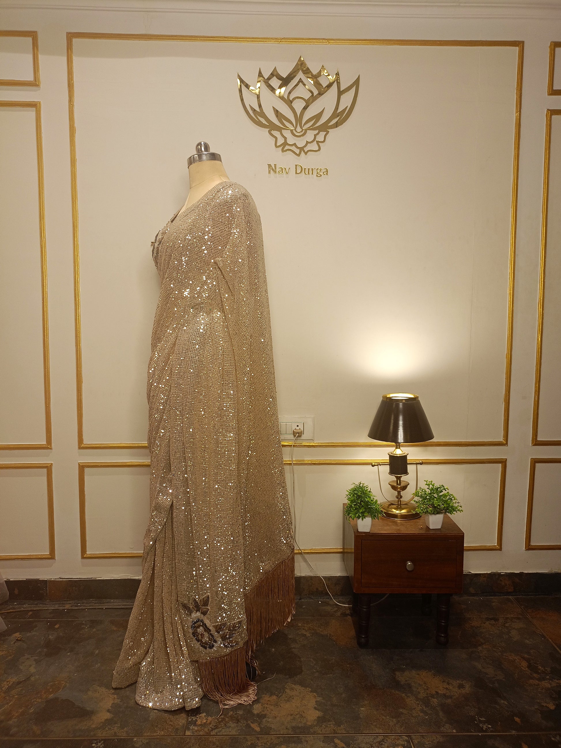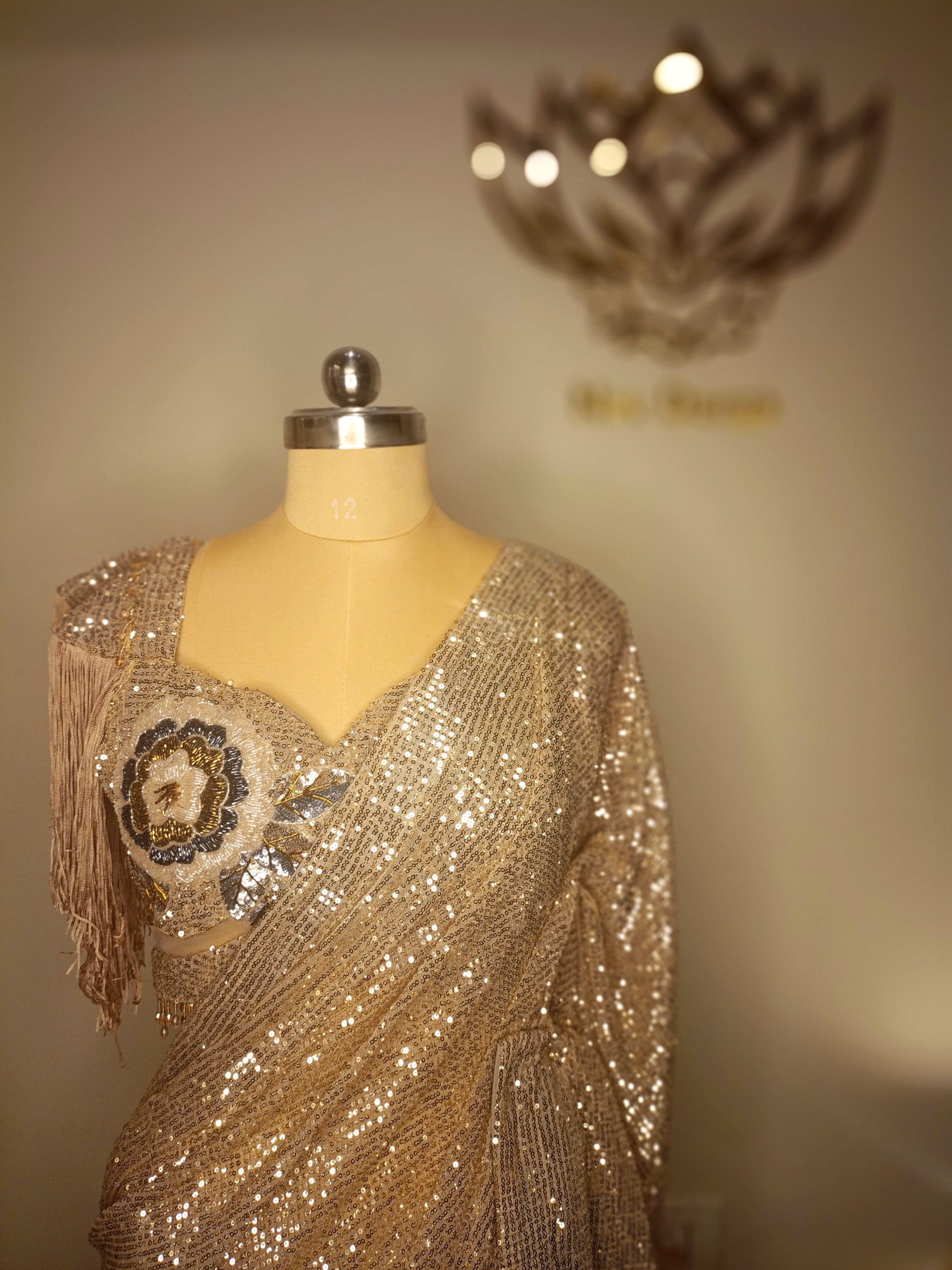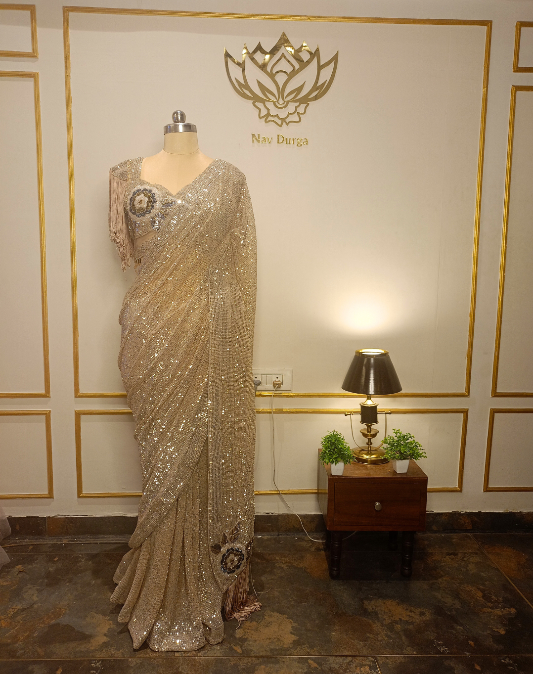 Turn every occasion into a statement moment with this gold net saree, adorned with sequins, patchwork, tassels, and shimmering crystals. The halter-strap neckline adds a bold contemporary touch, perfectly balancing tradition with modern flair—ideal for receptions, cocktail nights, or festive celebrations.