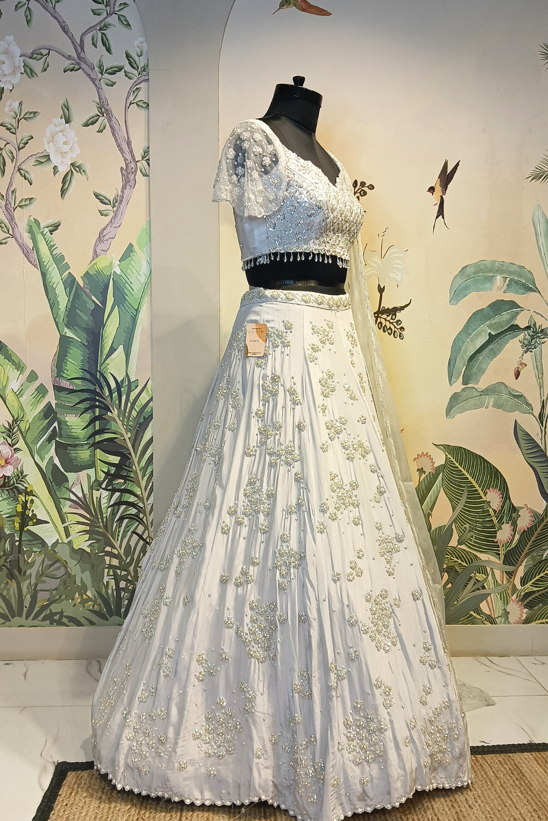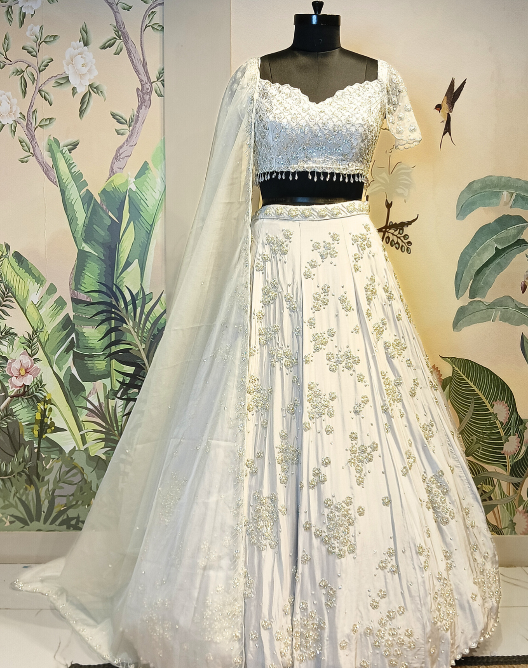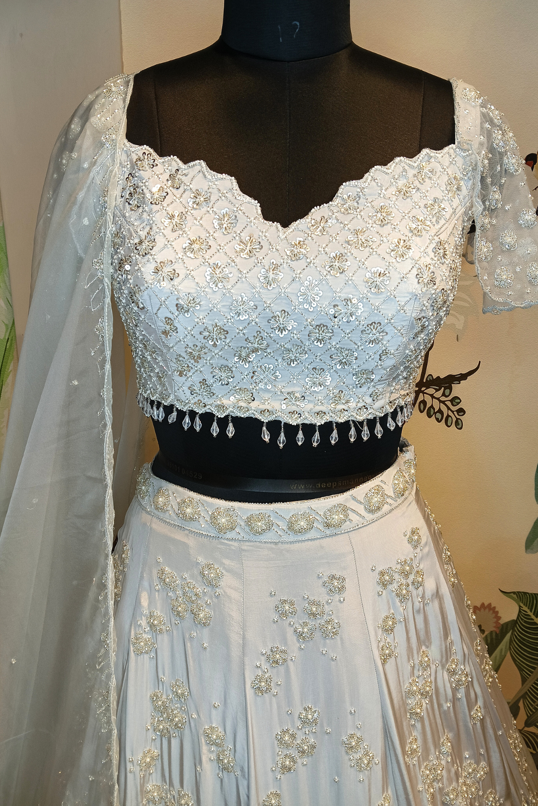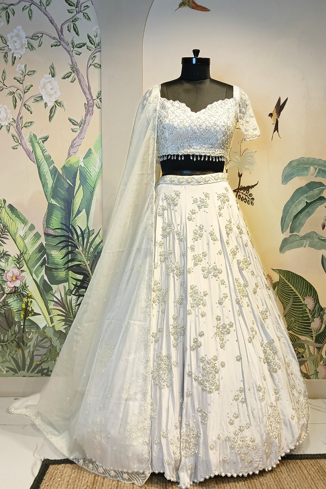 Crafted in luxurious grey crepe, this lehenga strikes the perfect balance between sophistication and shimmer. Adorned with fine cutdana, sequins, and crystal work, and finished with a unique cutwork neckline, it’s a refined choice for receptions, cocktail nights, and contemporary festive occasions.