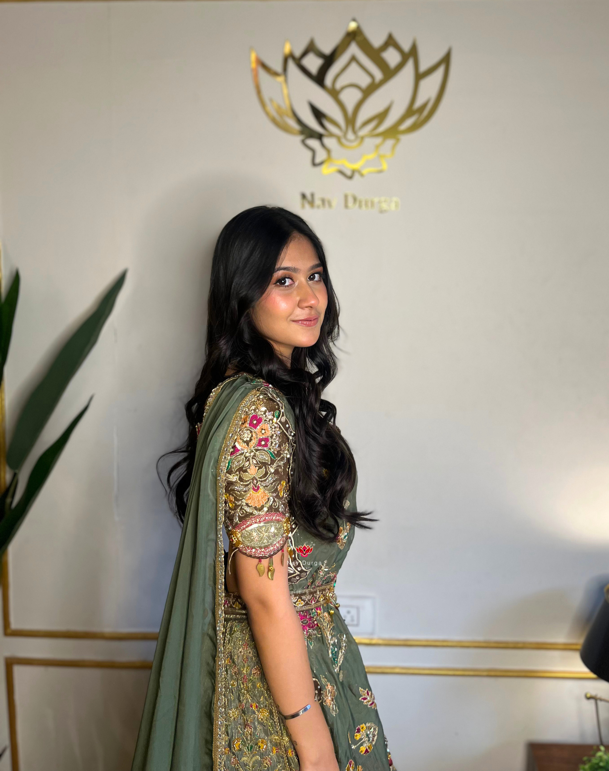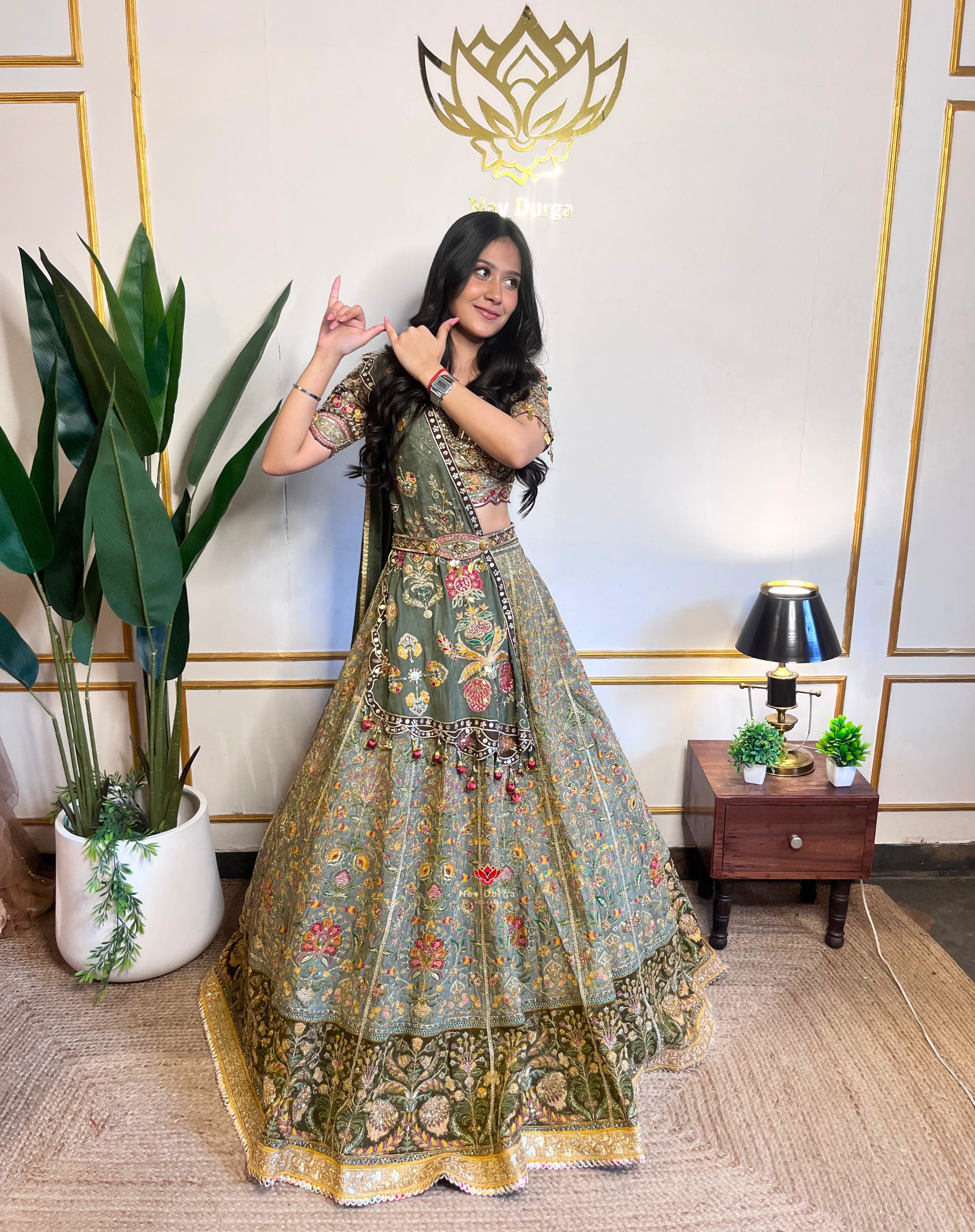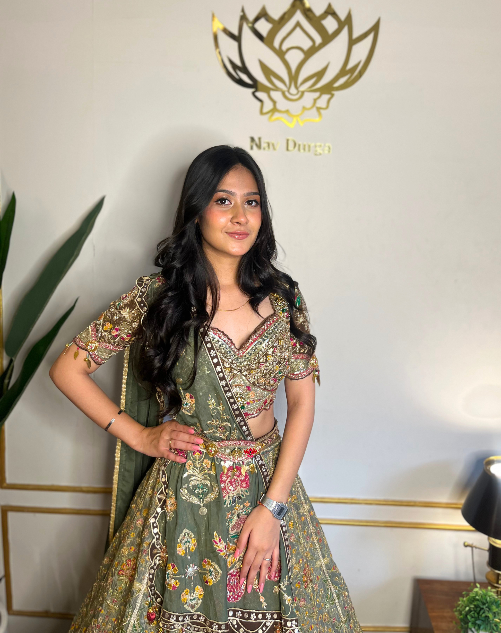 Crafted in rich olive-green tissue, this lehenga brings together fine craftsmanship and statement detailing. Intricate dabka, zardosi, mirror, nakshi, multicolor resham, and stone work create a layered, artisanal finish, while delicate latkans add movement and charm.