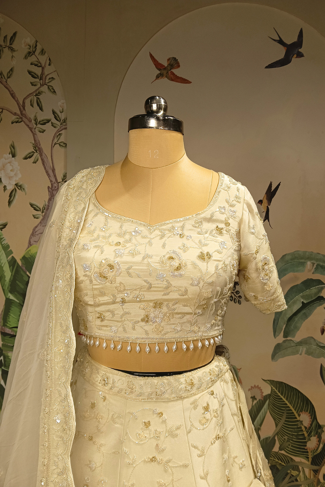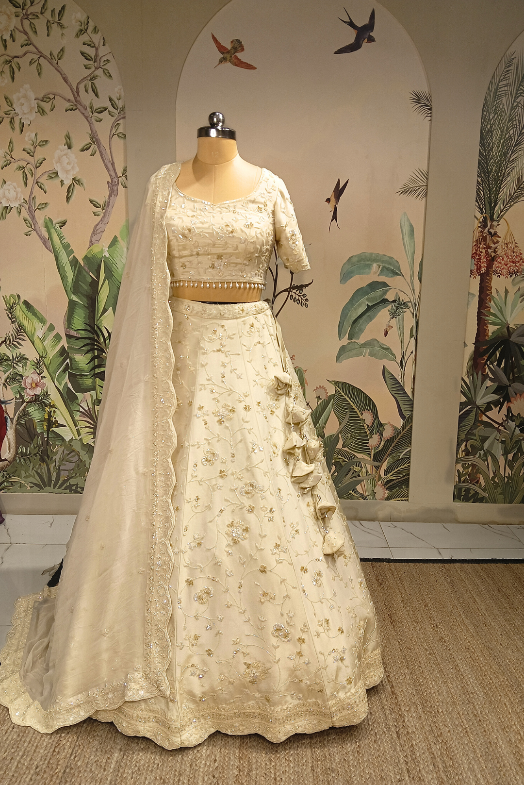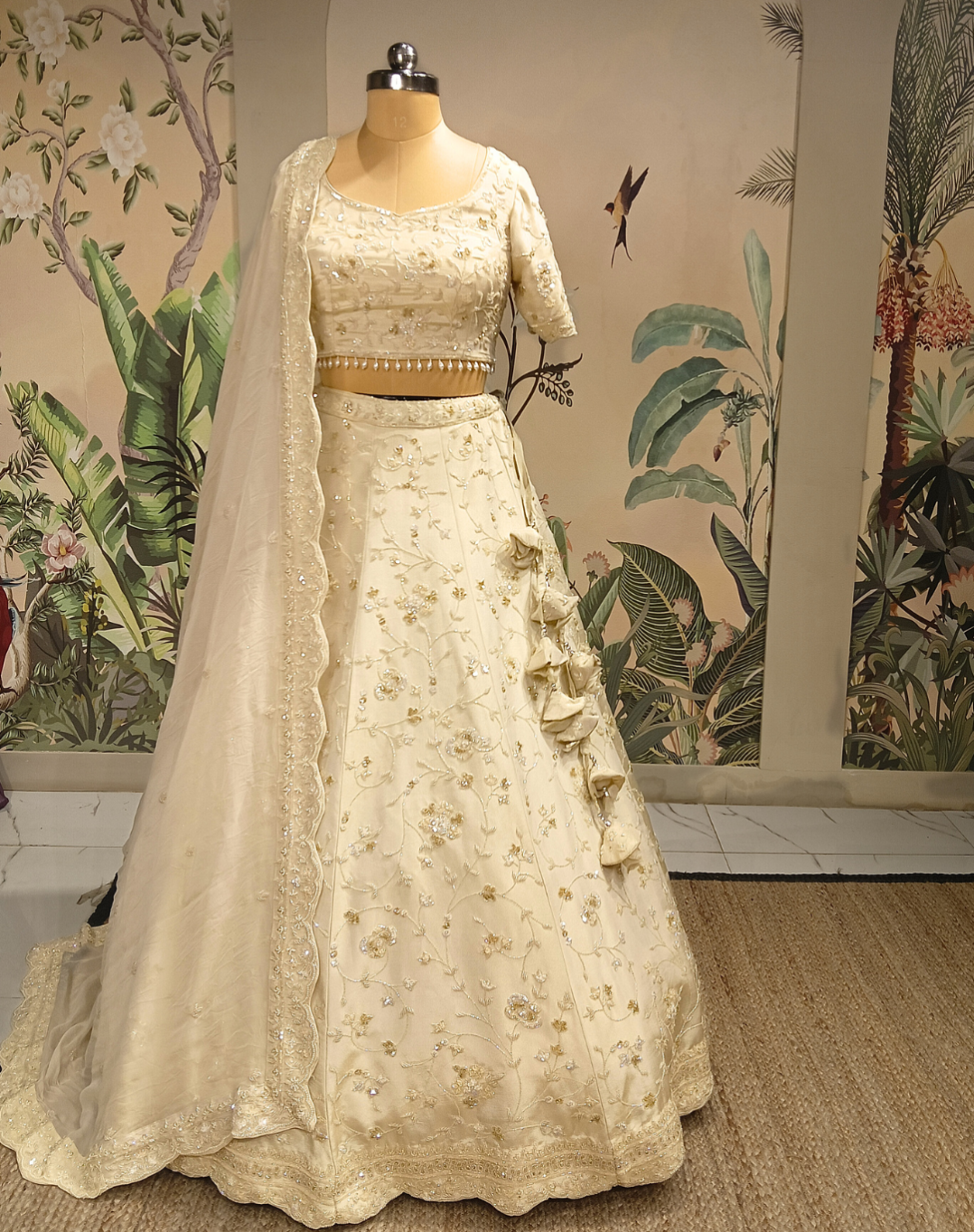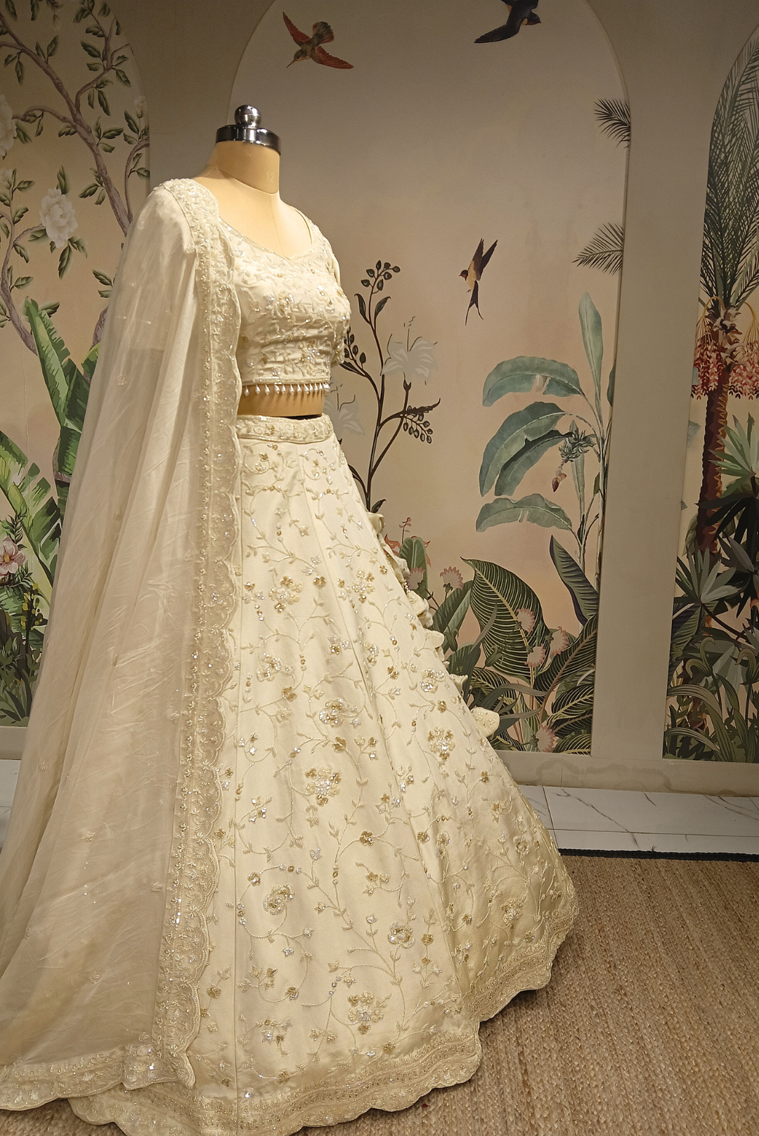 A vision in ivory, this tissue lehenga captures modern grace with its intricate cutdana, sequin, and crystal detailing. The subtle shimmer of the fabric paired with a sweetheart neckline creates a refined yet captivating look—perfect for weddings, receptions, or statement festive wear.