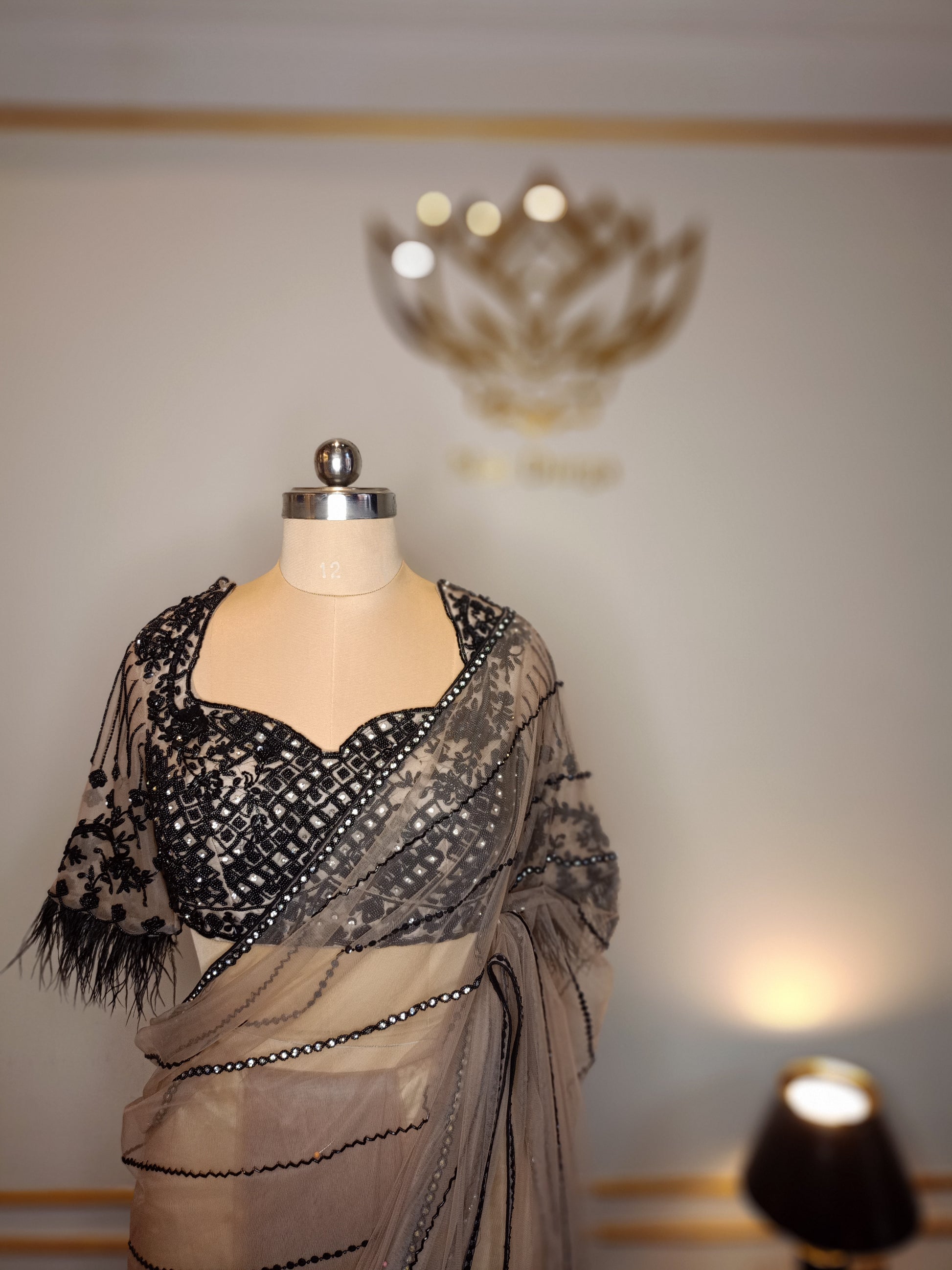 Turn heads with this striking gold and black net saree, paired with a stitched blouse that perfectly balances drama and elegance. Detailed with feather accents, cutdana, and sequin work, and finished with a flattering sweetheart neckline, this piece is crafted for evenings where style makes the loudest statement.