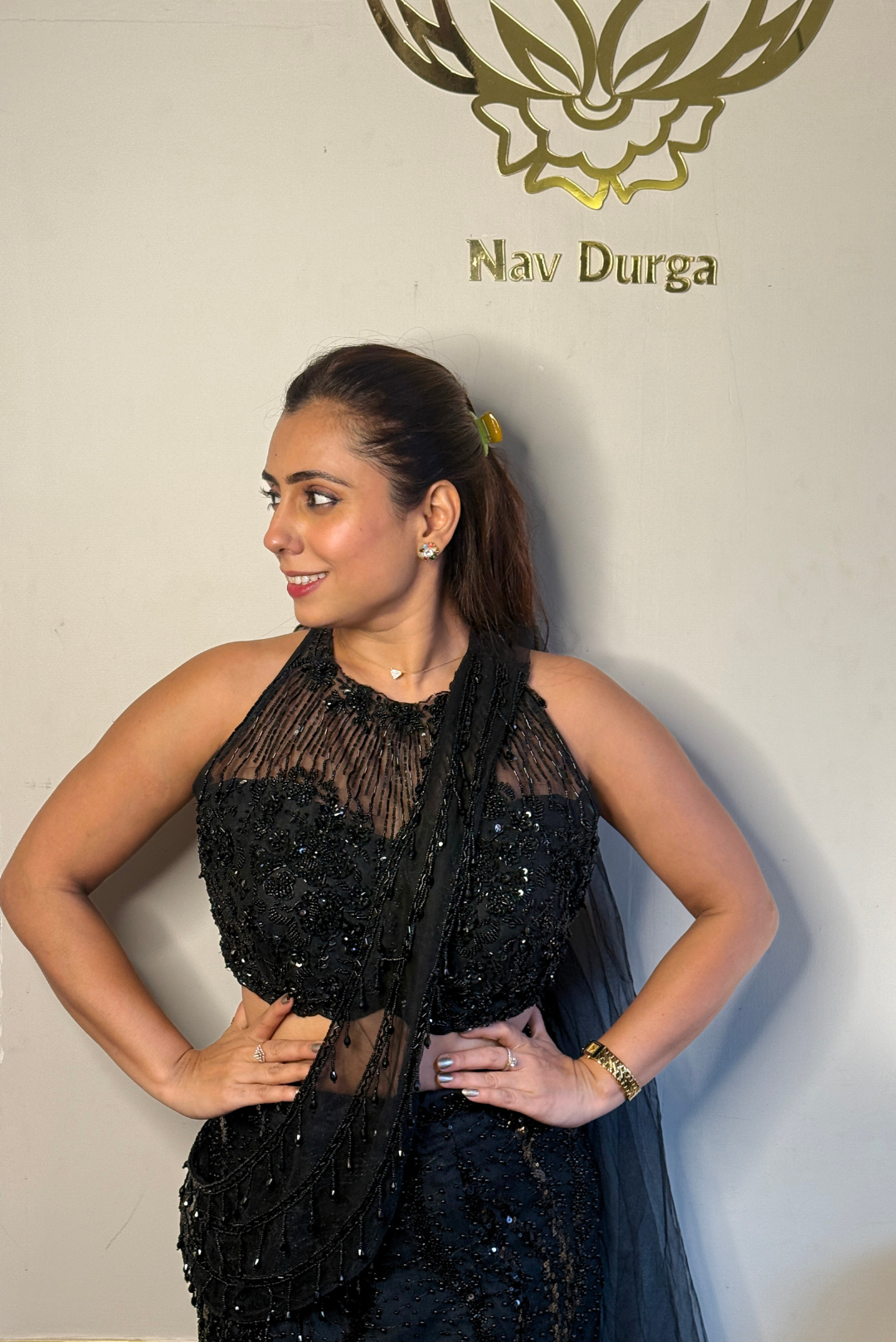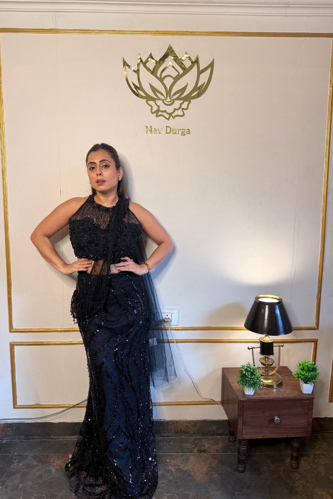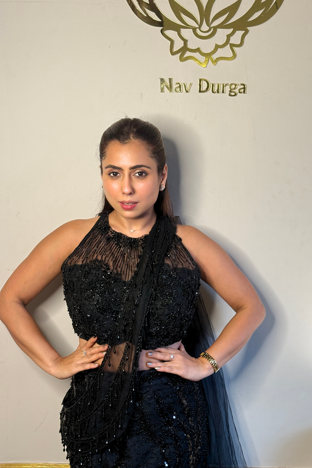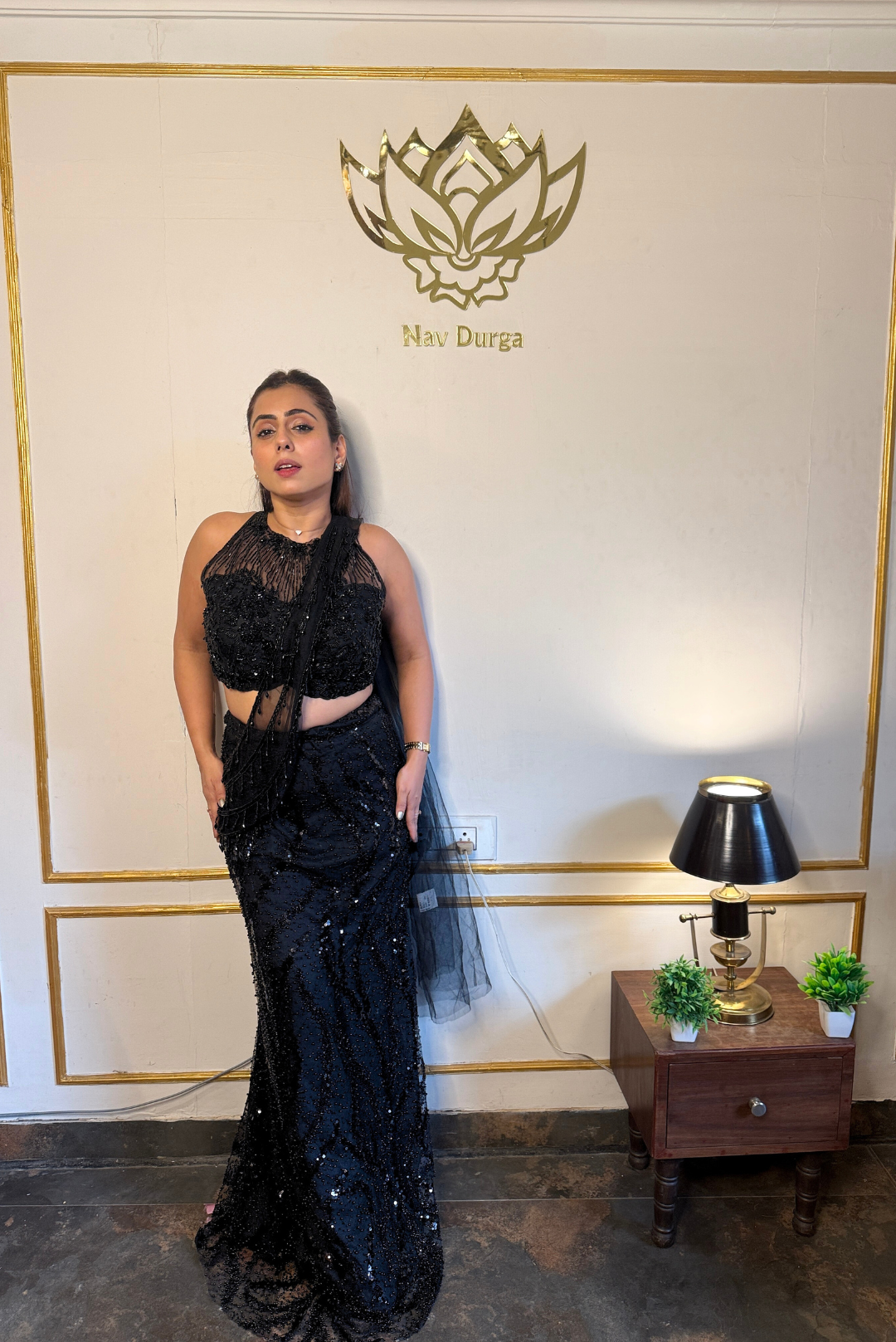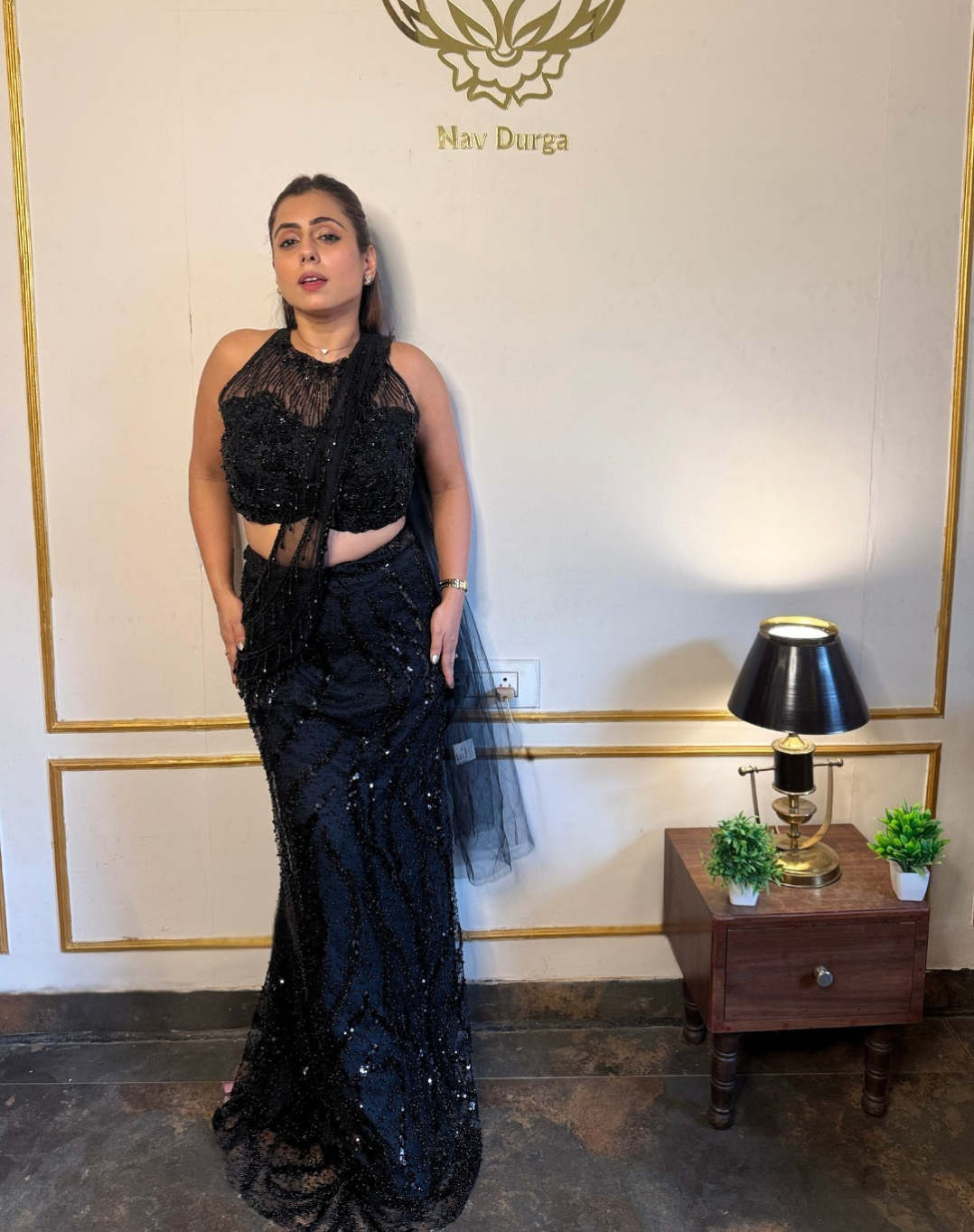 This black Indo-Western piece is designed to make a quiet yet powerful statement. Crafted in sheer net fabric, it features detailed cutdana, sequin, bead, and crystal work that catches the light beautifully without feeling heavy. The high-neck halter silhouette adds a sharp, contemporary edge, making it an ideal choice for cocktail nights, receptions, or elevated festive gatherings.