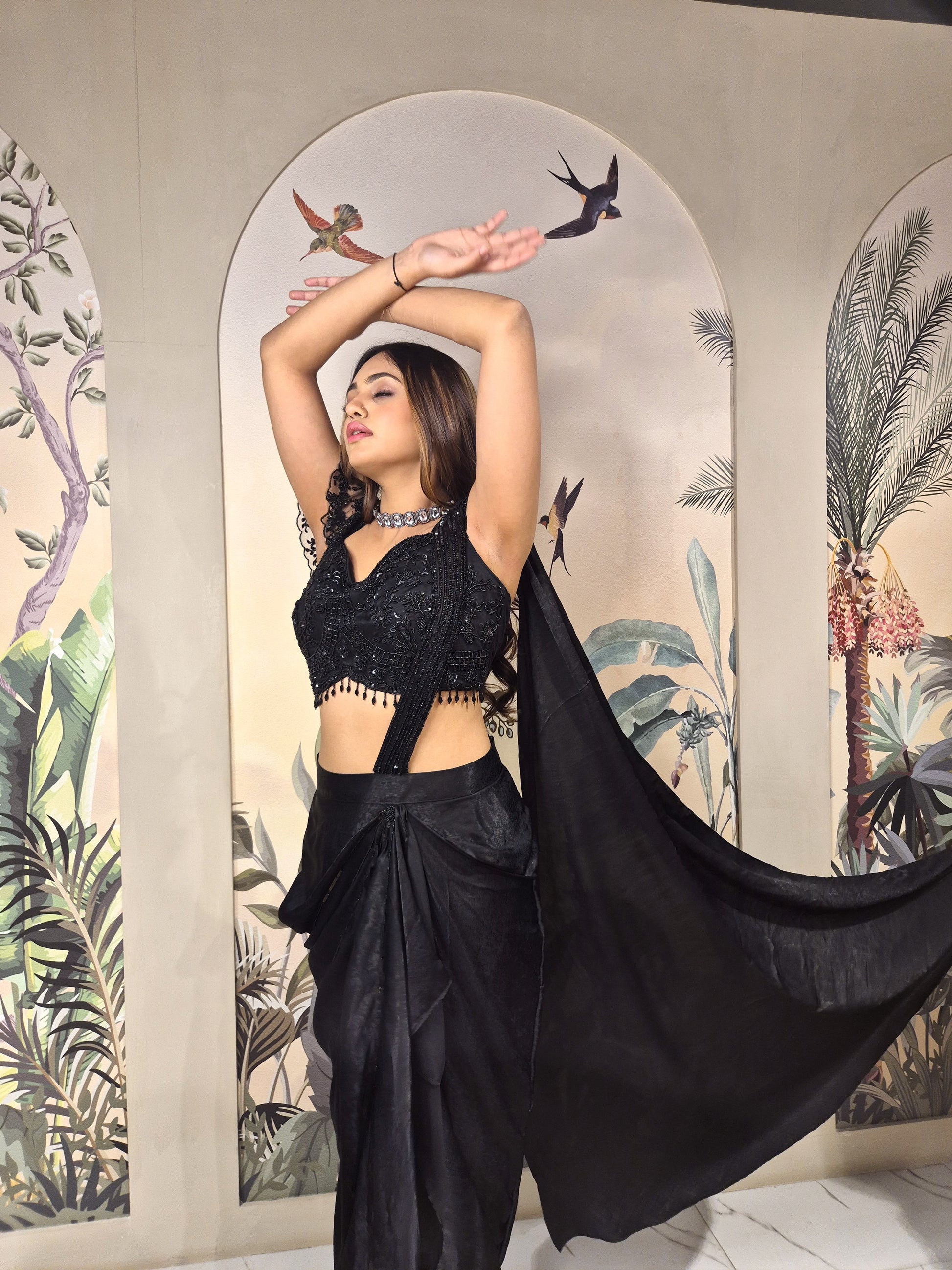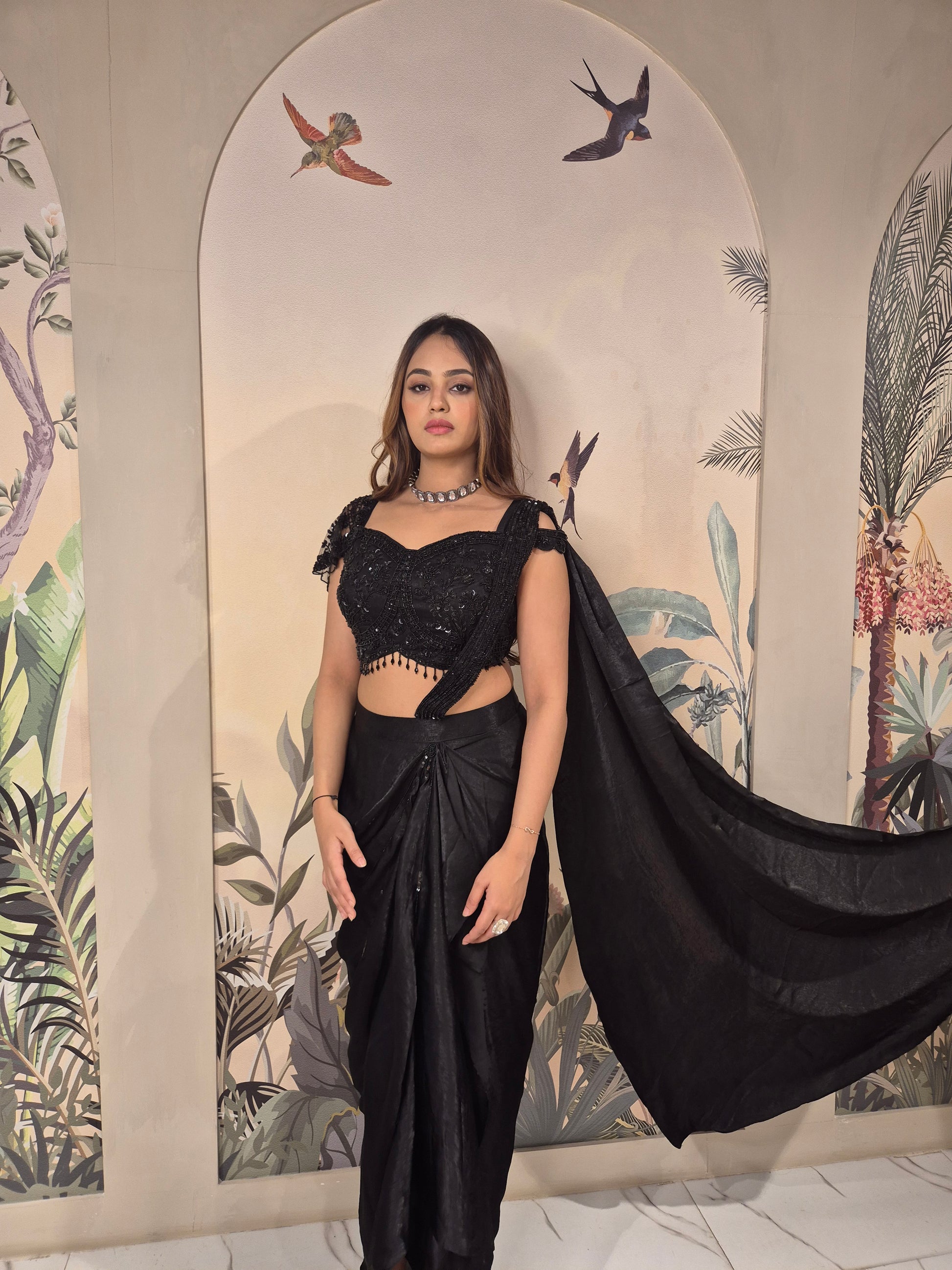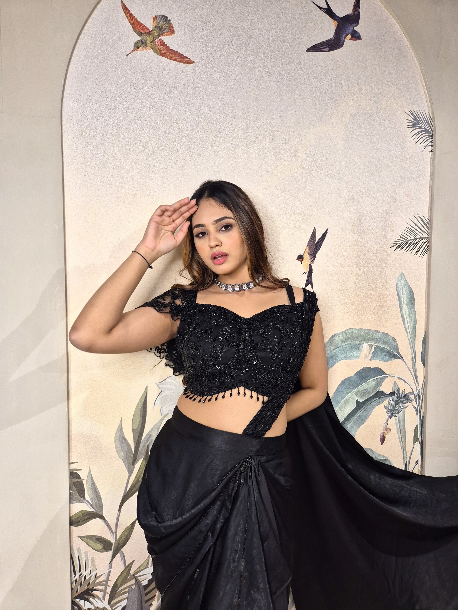 Bold and contemporary, this black Indo-Western set features a chic draped crepe skirt paired with a sweetheart neckline blouse. Intricately adorned with sequins, cutdana, and playful tassels, it’s the perfect blend of glamour and modern elegance—ideal for cocktail nights, sangeet, or high-fashion festive events.