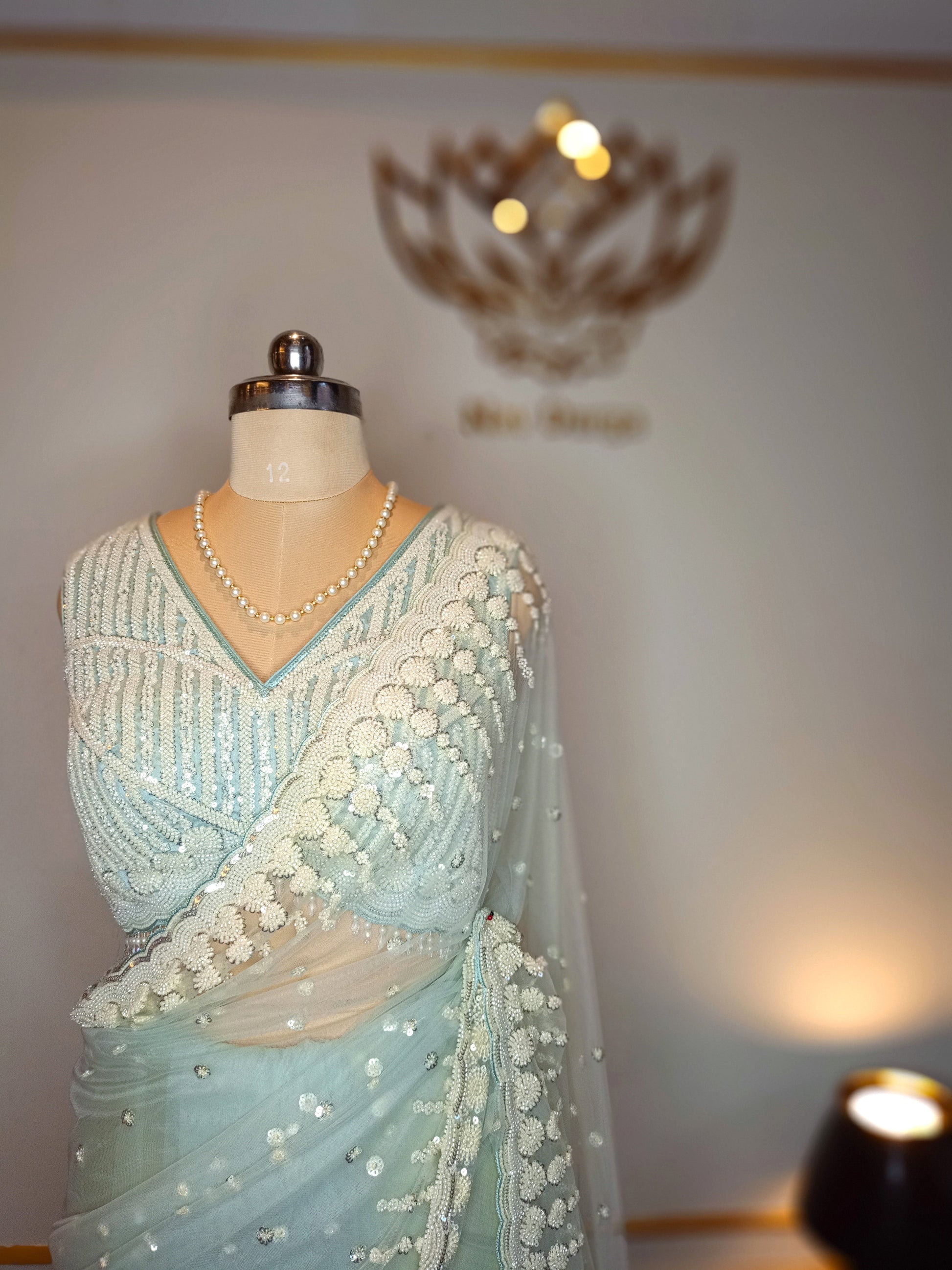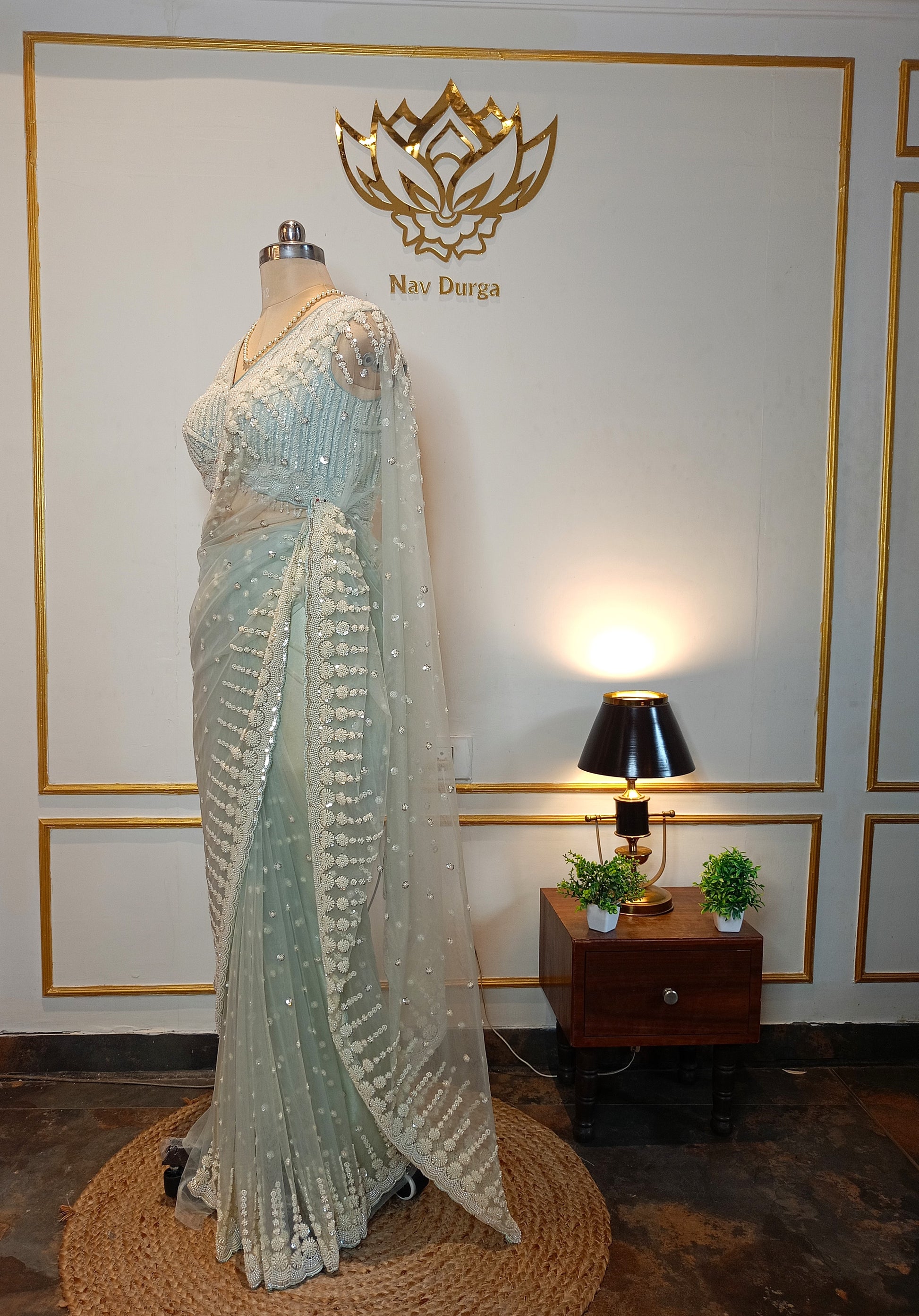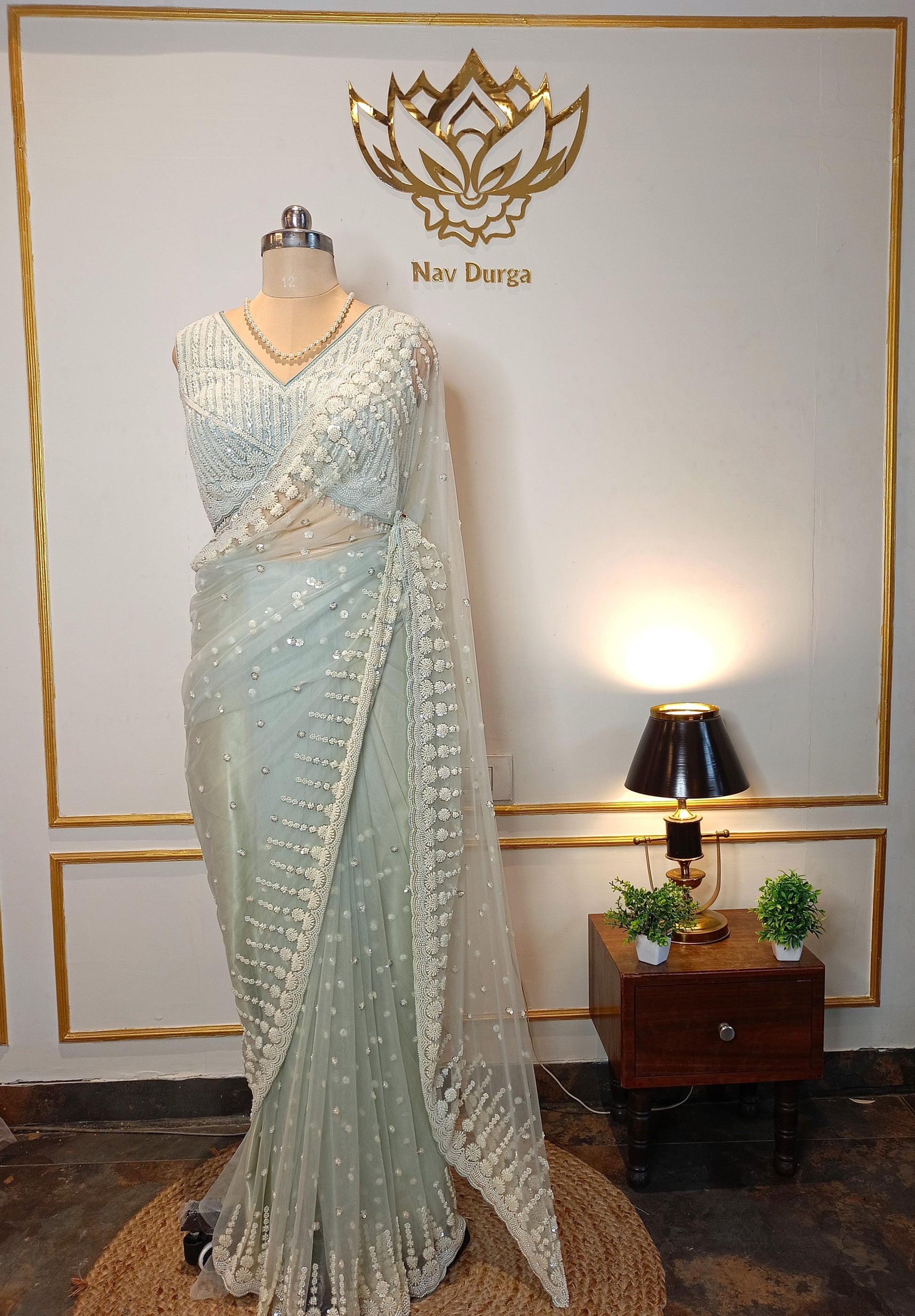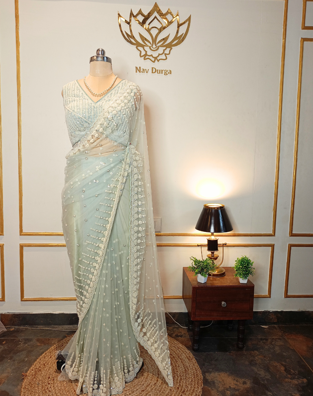 Refreshingly chic, this aqua net saree brings together the sparkle of cutdana, chir, and sequins with a graceful V-neck stitched blouse. Light yet striking, it’s the perfect pick for daytime weddings, cocktail evenings, or festive gatherings where style meets comfort.