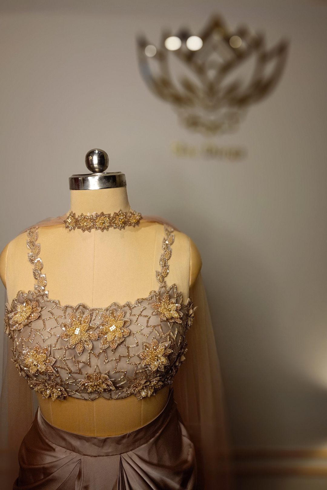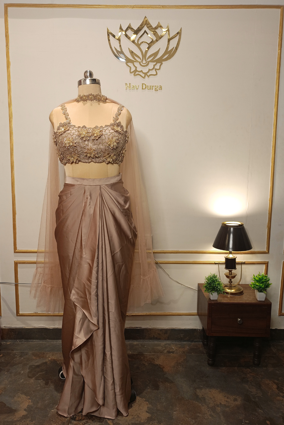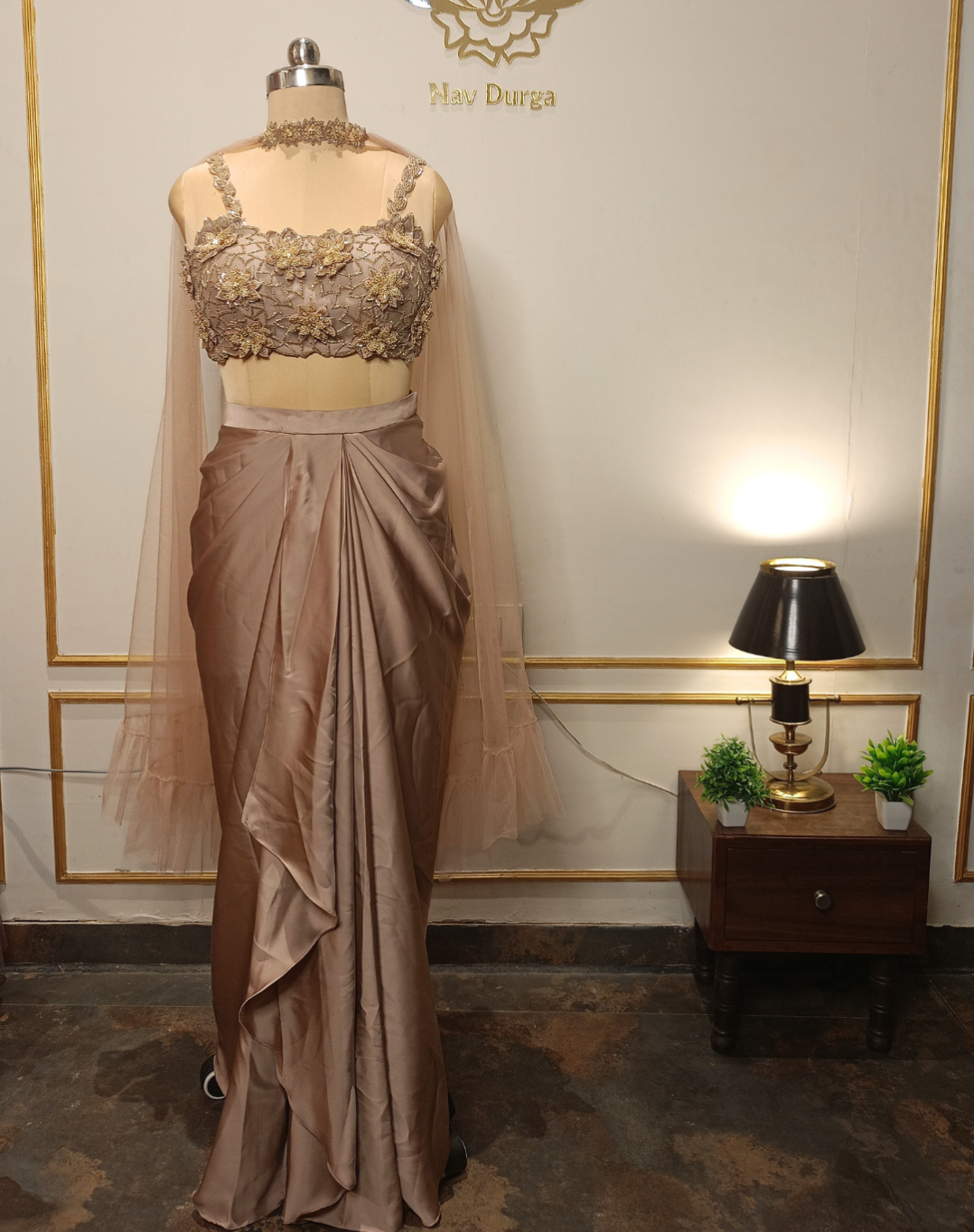 Soft, fluid, and effortlessly refined — this pastel brown satin drape saree captures modern grace with its delicate floral sequins, chir, and cutdana detailing. The sweetheart neckline adds a romantic touch, making it the perfect pick for cocktail evenings, festive dinners, or intimate celebrations.