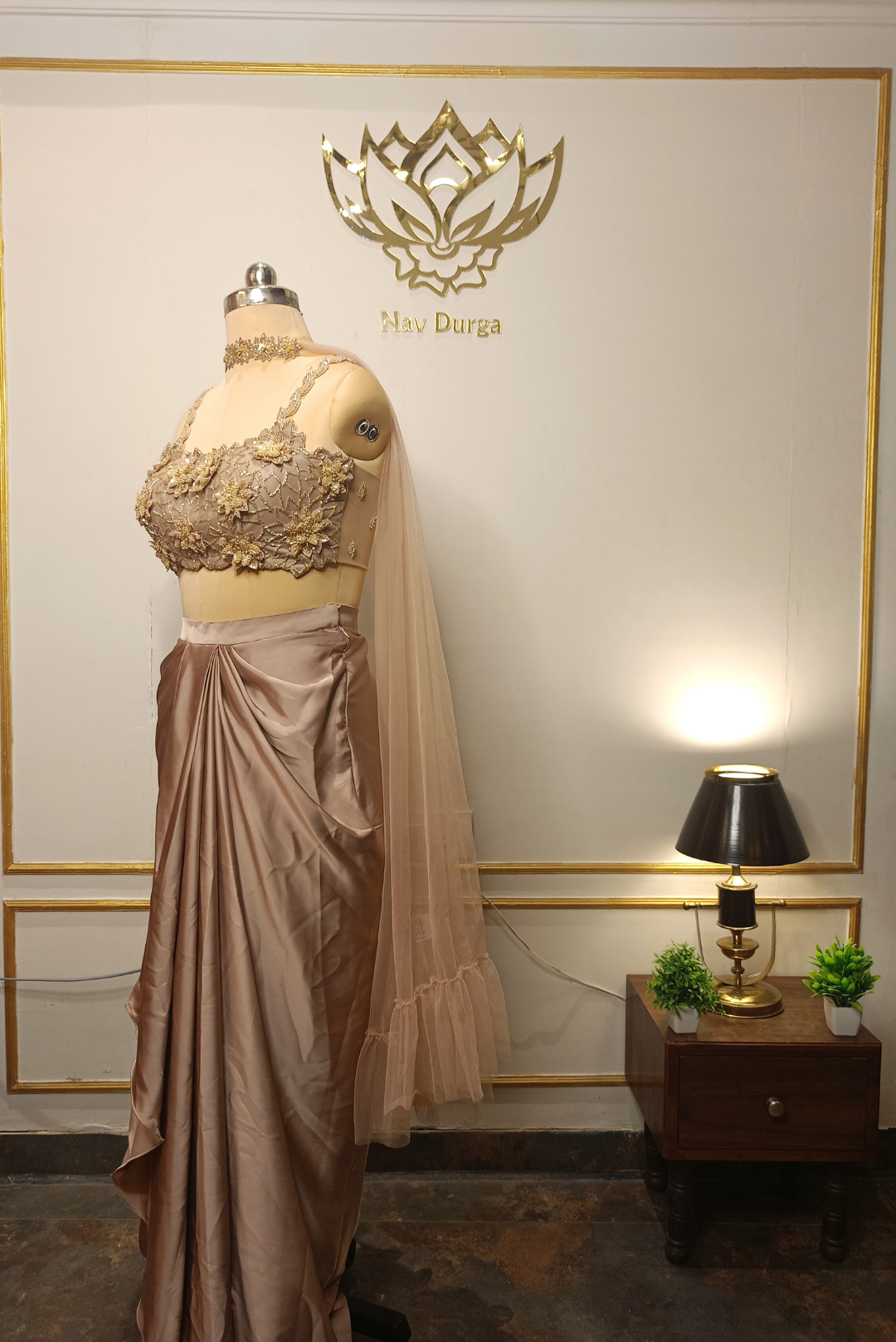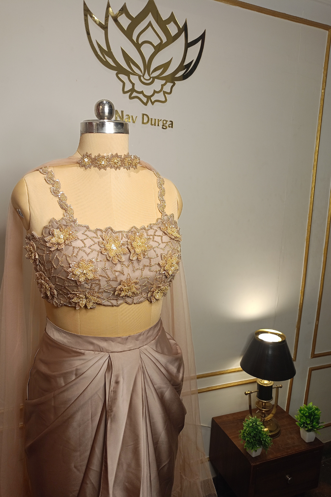 Pattern: Pre-Draped Saree with Floral Accents