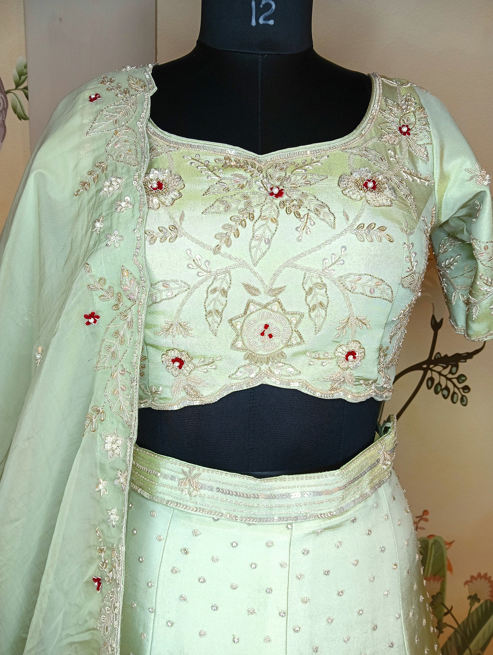 Crafted in luxurious Anmol tissue, this green lehenga is a masterpiece of artistry. Adorned with cutdana, sequins, zardosi, moti, and fine threadwork, it blends traditional detailing with a contemporary sweetheart neckline—making it an unforgettable choice for weddings, receptions, and festive celebrations.