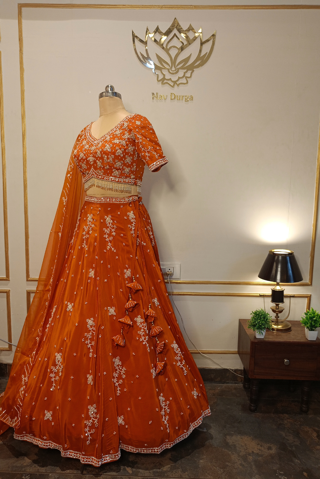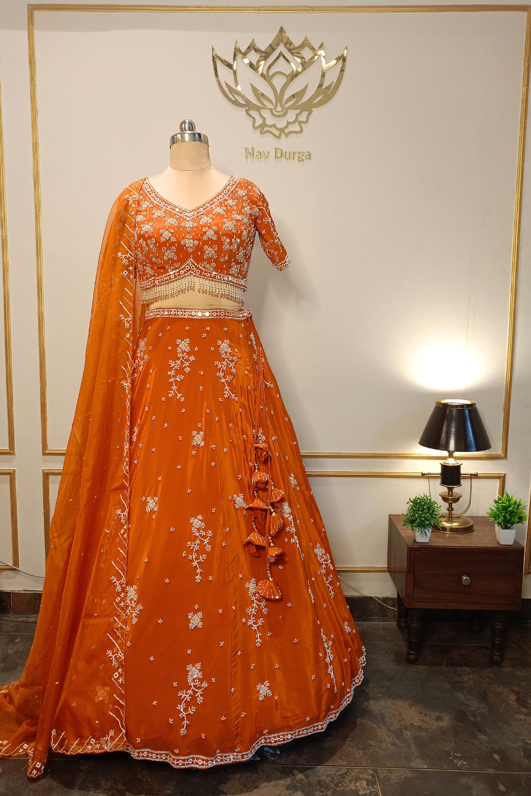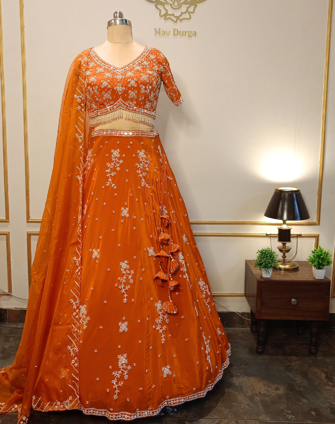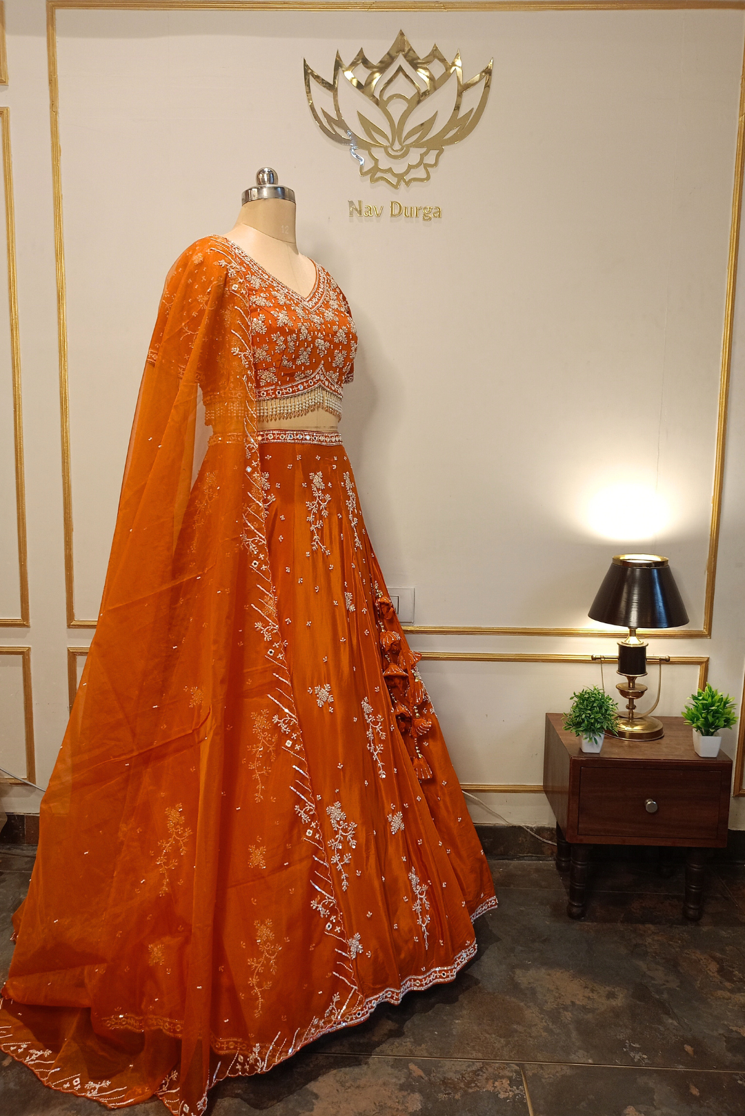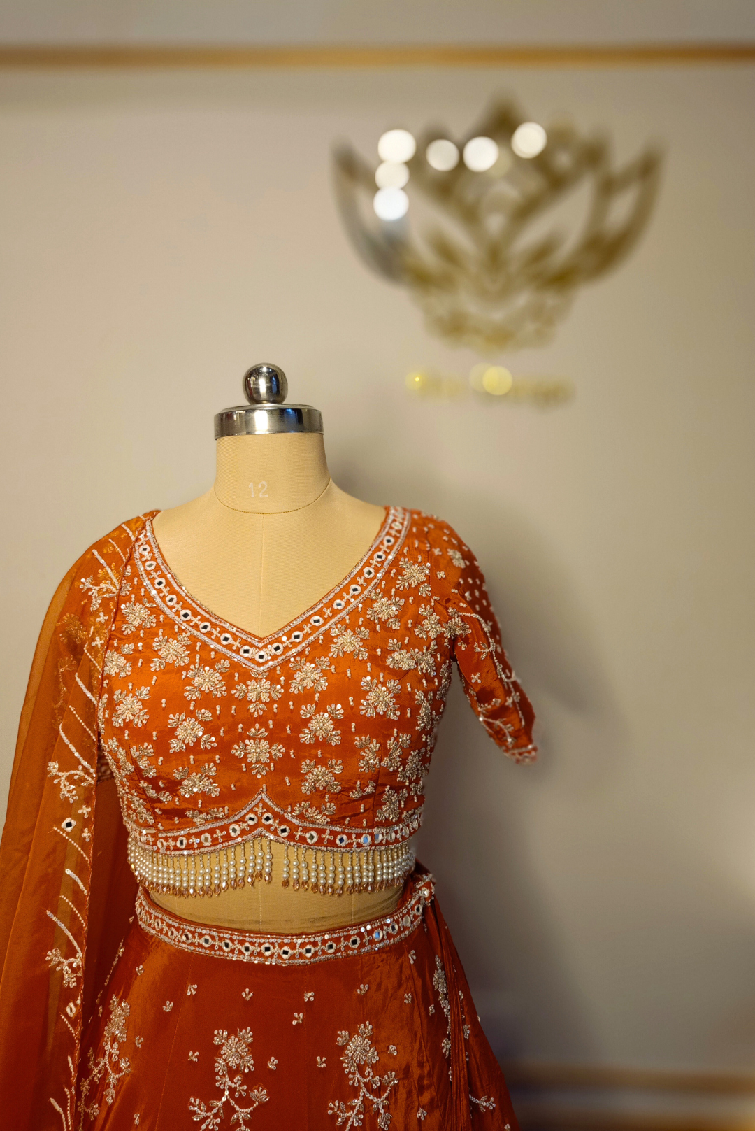 Turn every head in this striking rust crepe lehenga, beautifully adorned with cutdana, chir, sequins, crystals, moti, and mirror work. The refined V-neckline adds a touch of modern poise, while the rich craftsmanship lends it a regal charm—perfect for sangeet nights, festive soirées, or intimate wedding celebrations.