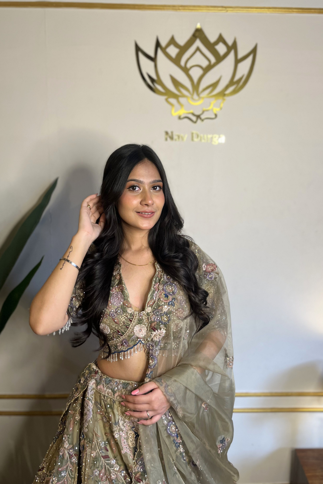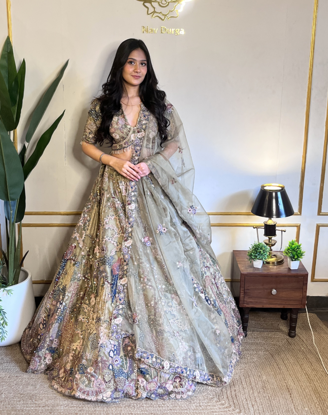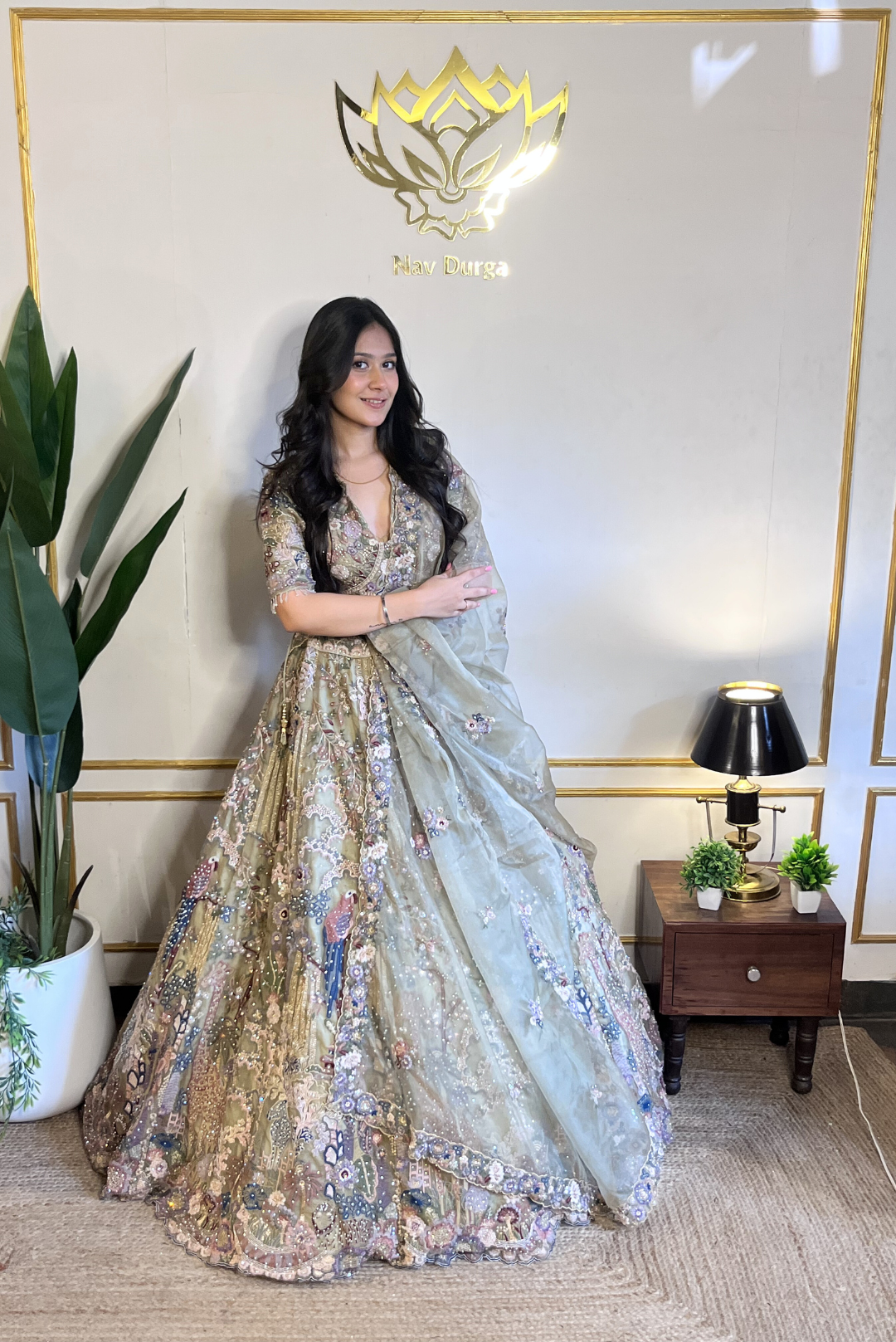 Grace meets modern charm in this sage green lehenga crafted from sheer organza, delicately adorned with fine threadwork and subtle crystal embellishments. The elegant V-neckline enhances its feminine appeal, making it a refined choice for engagement ceremonies, daytime weddings, or sophisticated festive gatherings.