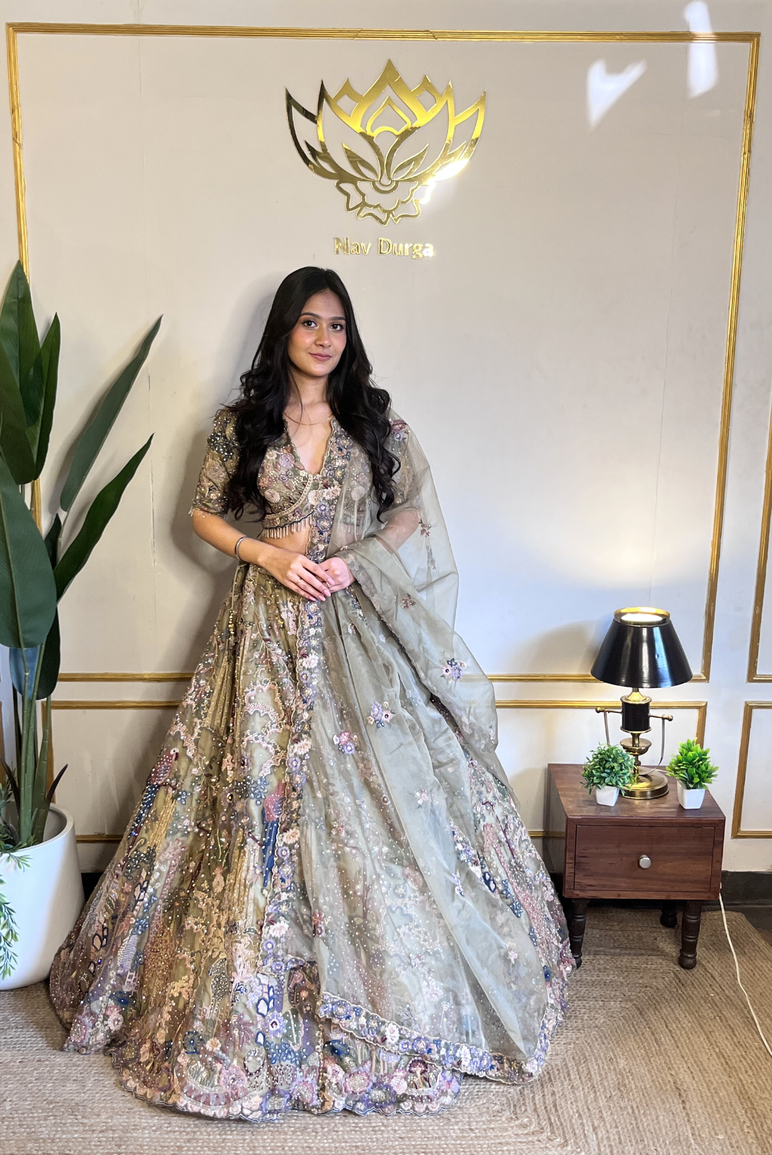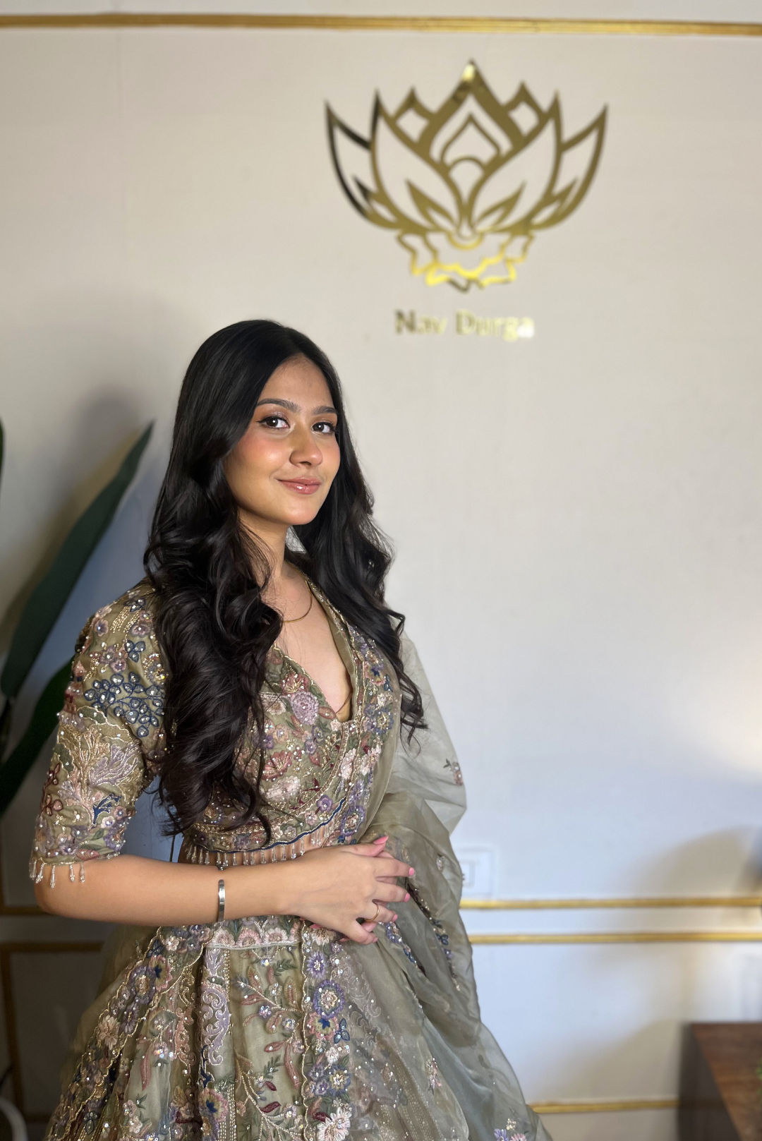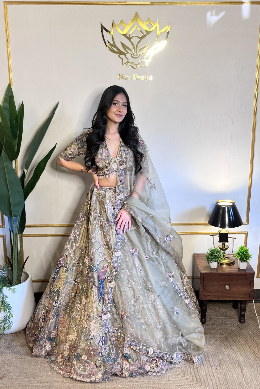 Grace meets modern charm in this sage green lehenga crafted from sheer organza, delicately adorned with fine threadwork and subtle crystal embellishments. The elegant V-neckline enhances its feminine appeal, making it a refined choice for engagement ceremonies, daytime weddings, or sophisticated festive gatherings.