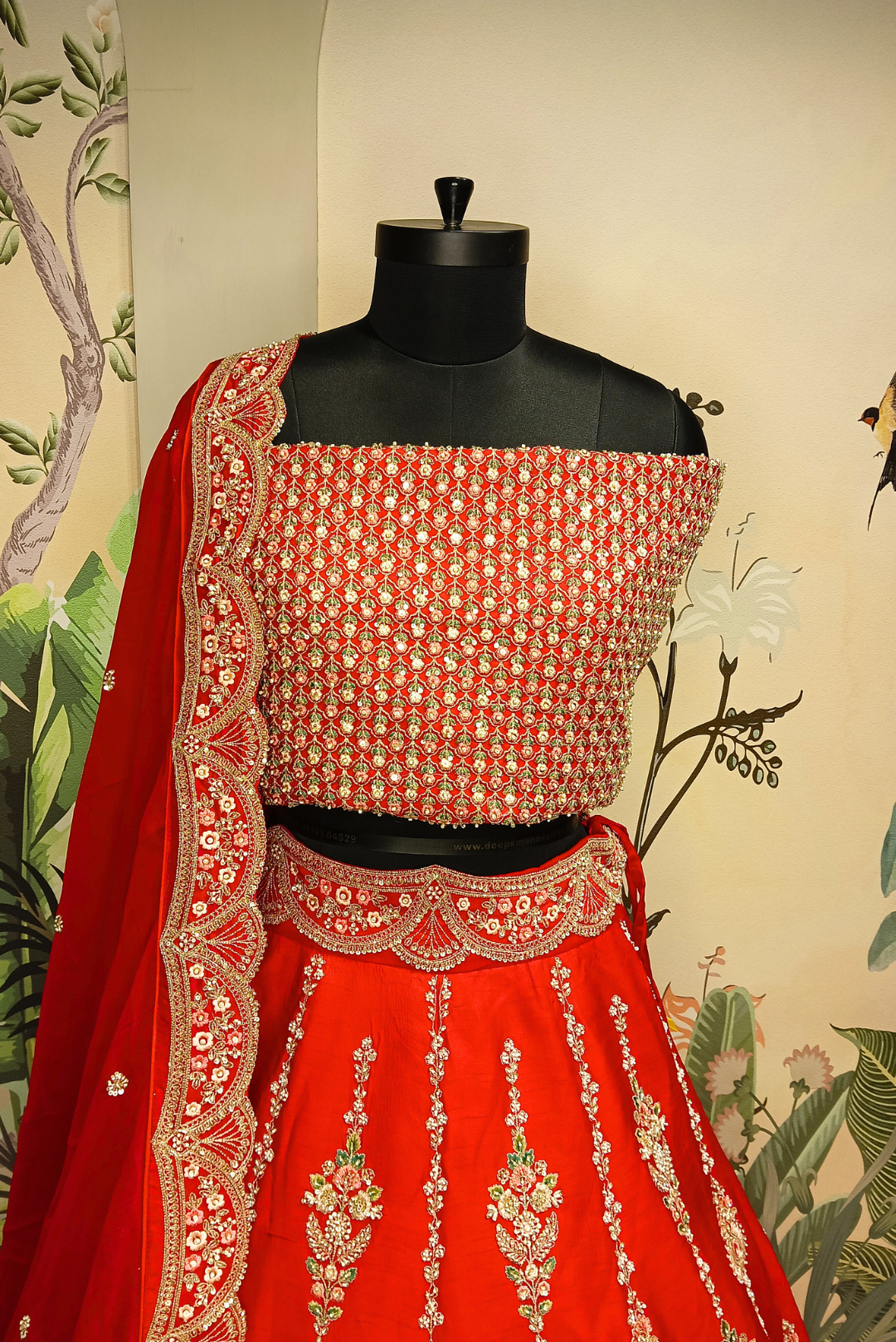 Make your wedding day unforgettable with this regal red bridal lehenga, crafted in luxurious raw silk. Adorned with intricate cutdana, sequins, pearls, dabka, and fine threadwork, it exudes timeless grandeur. Paired with an unstitched blouse for a tailored fit, this lehenga is designed to make every bride feel majestic and radiant.
