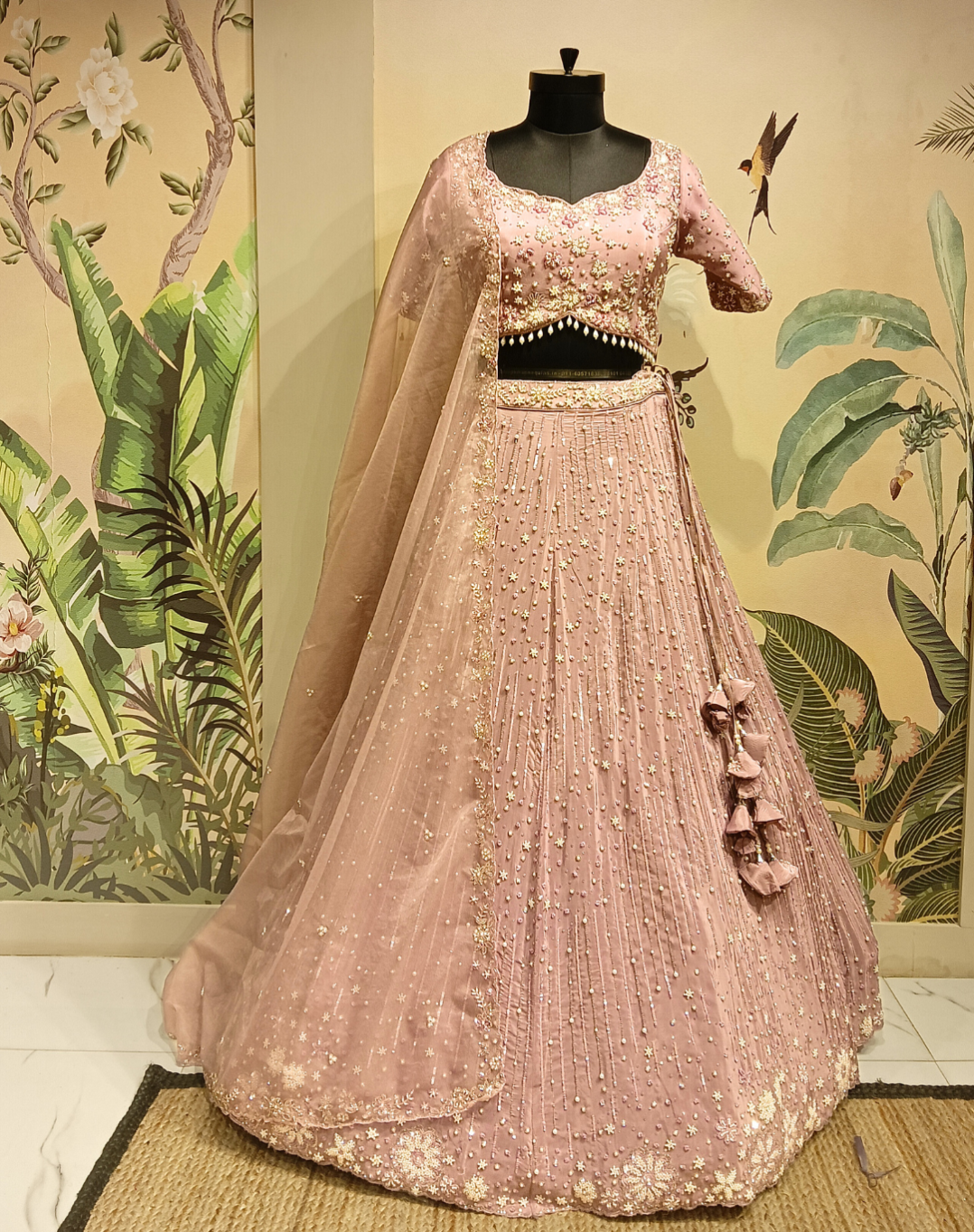 A perfect blend of charm and sophistication, this pink crepe lehenga features exquisite detailing with moti, cutdana, sequins, and crystal work. The delicate cutwork neckline lends it a unique appeal, making it an ideal choice for weddings, receptions, and festive soirées.