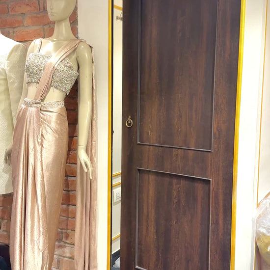 Make a striking statement in this grey fishcut lehenga, crafted in sheer net and adorned with dazzling cutdana, sequins, and crystal work. The graceful Round V neckline complements its sculpted silhouette, making it the perfect choice for receptions, cocktail nights, or glamorous festive evenings.