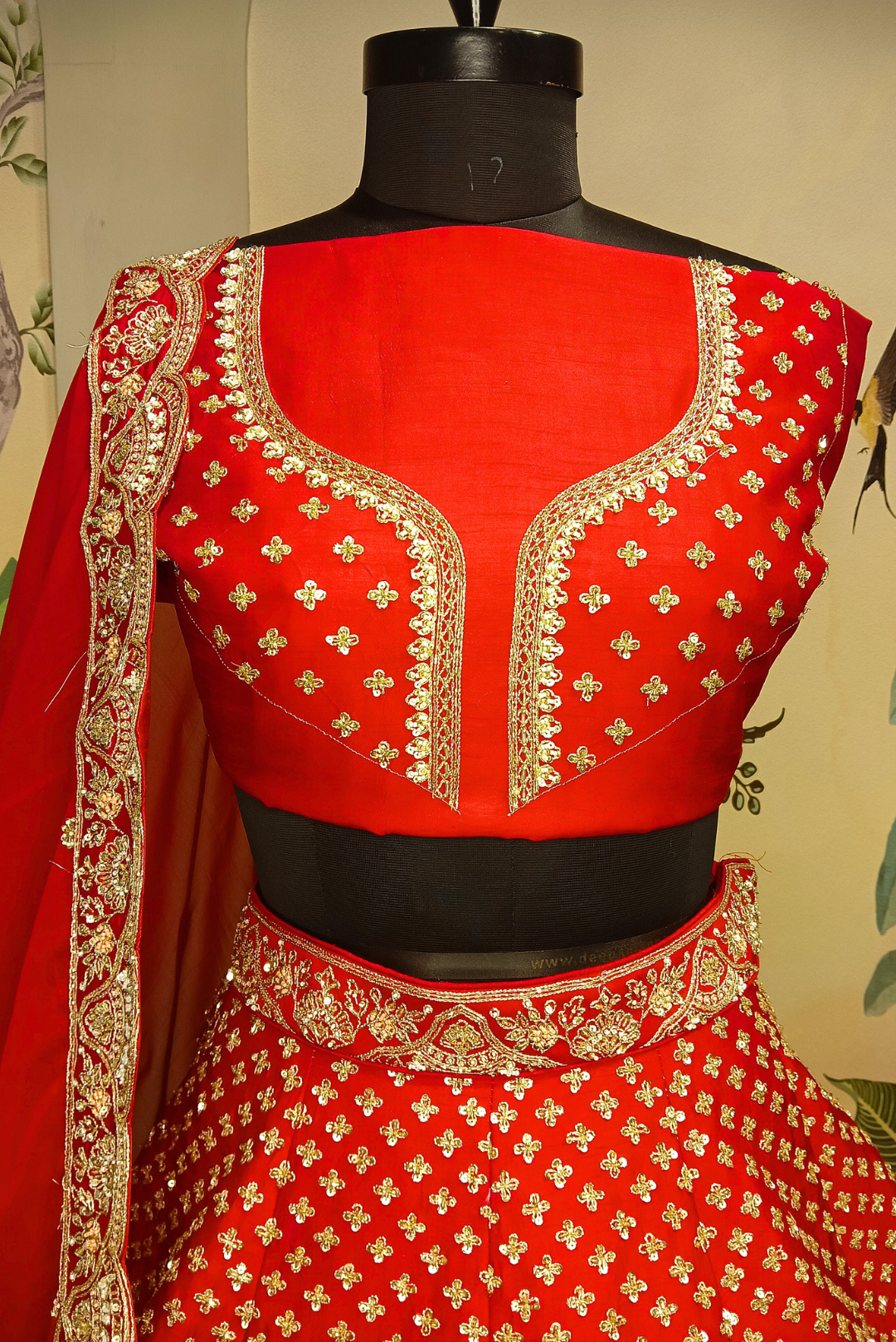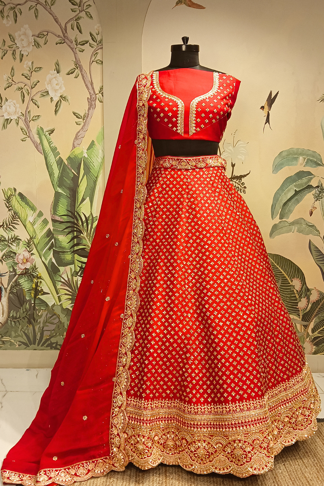 Make your wedding day unforgettable with this regal red bridal lehenga, crafted in luxurious raw silk. Intricately adorned with cutdana, sequins, pearls, dabka, and fine threadwork, it captures the essence of tradition while radiating grandeur. Paired with an unstitched blouse for a tailored fit, this masterpiece is designed to make every bride feel truly majestic.